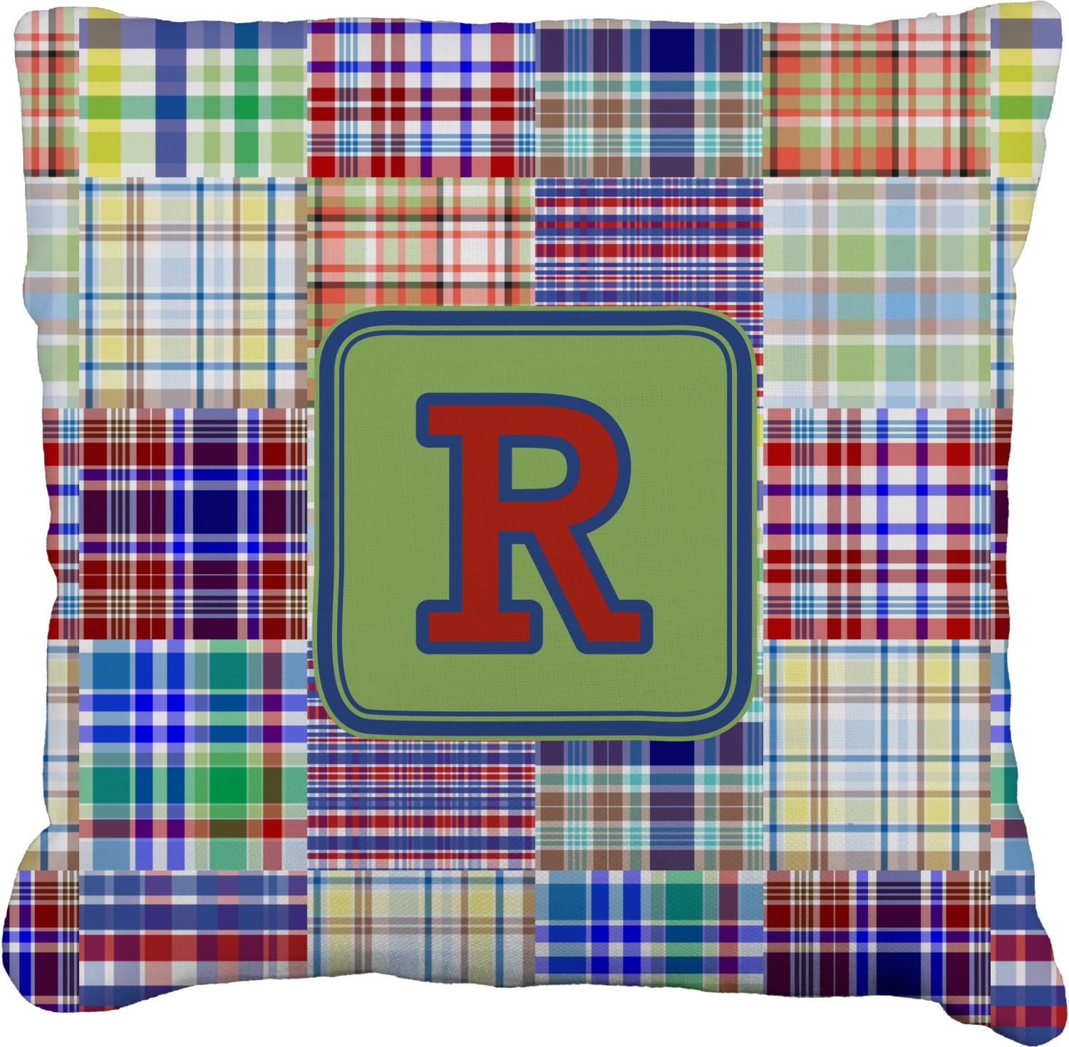 A square label is the perfect place for your initial, to make this collection of plaids truly you.
