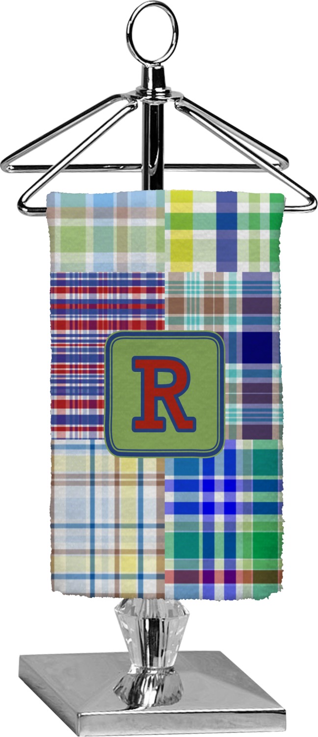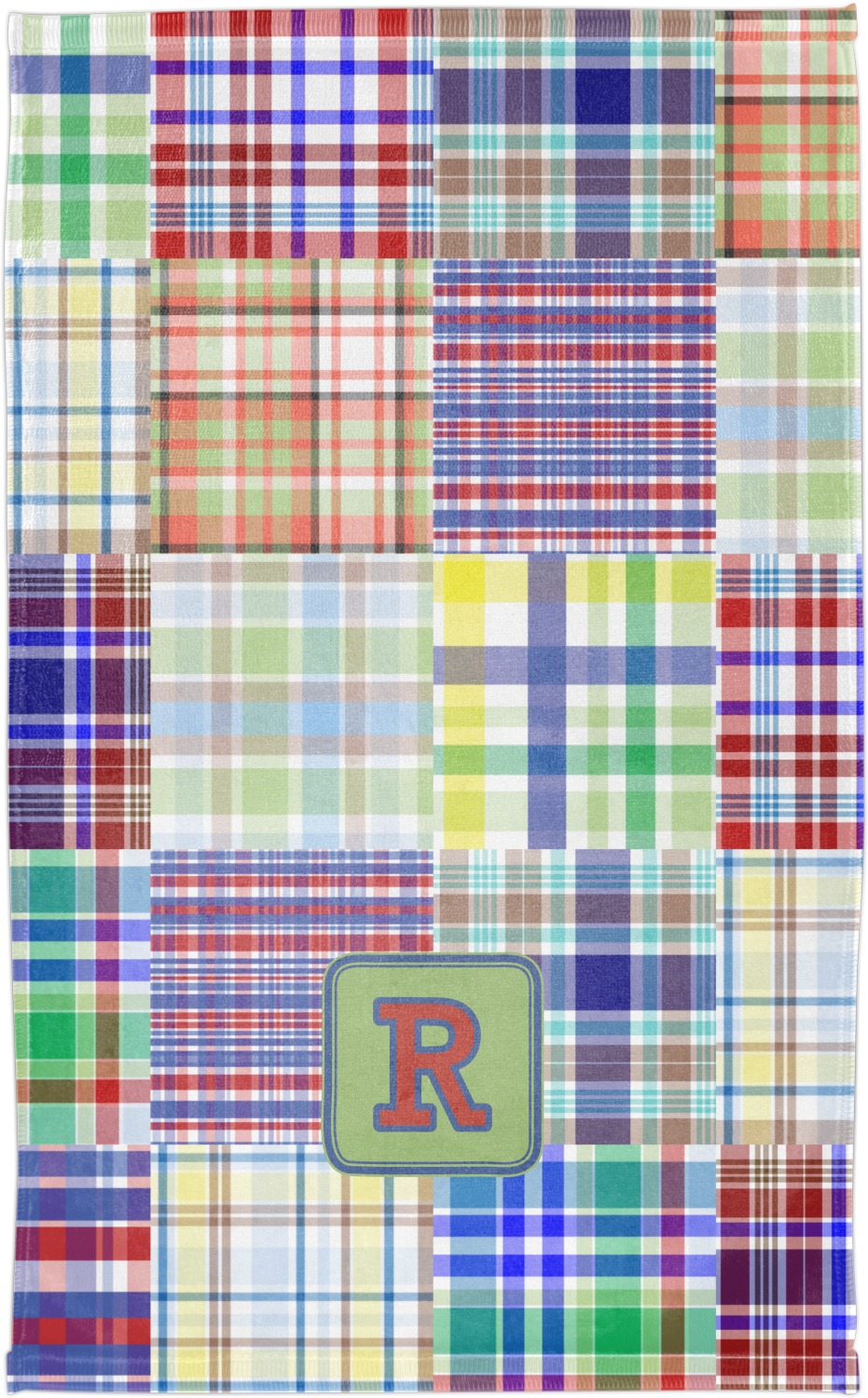 A square label is the perfect place for your initial, to make this collection of plaids truly you.