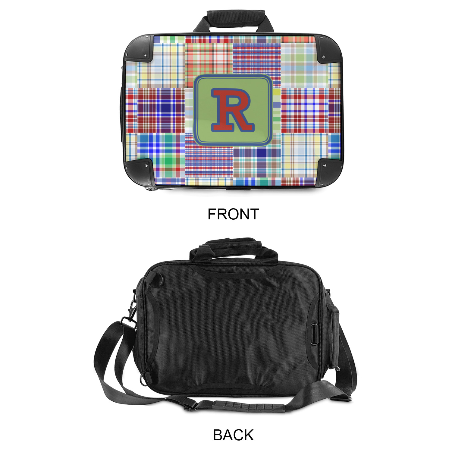 A square label is the perfect place for your initial, to make this collection of plaids truly you.