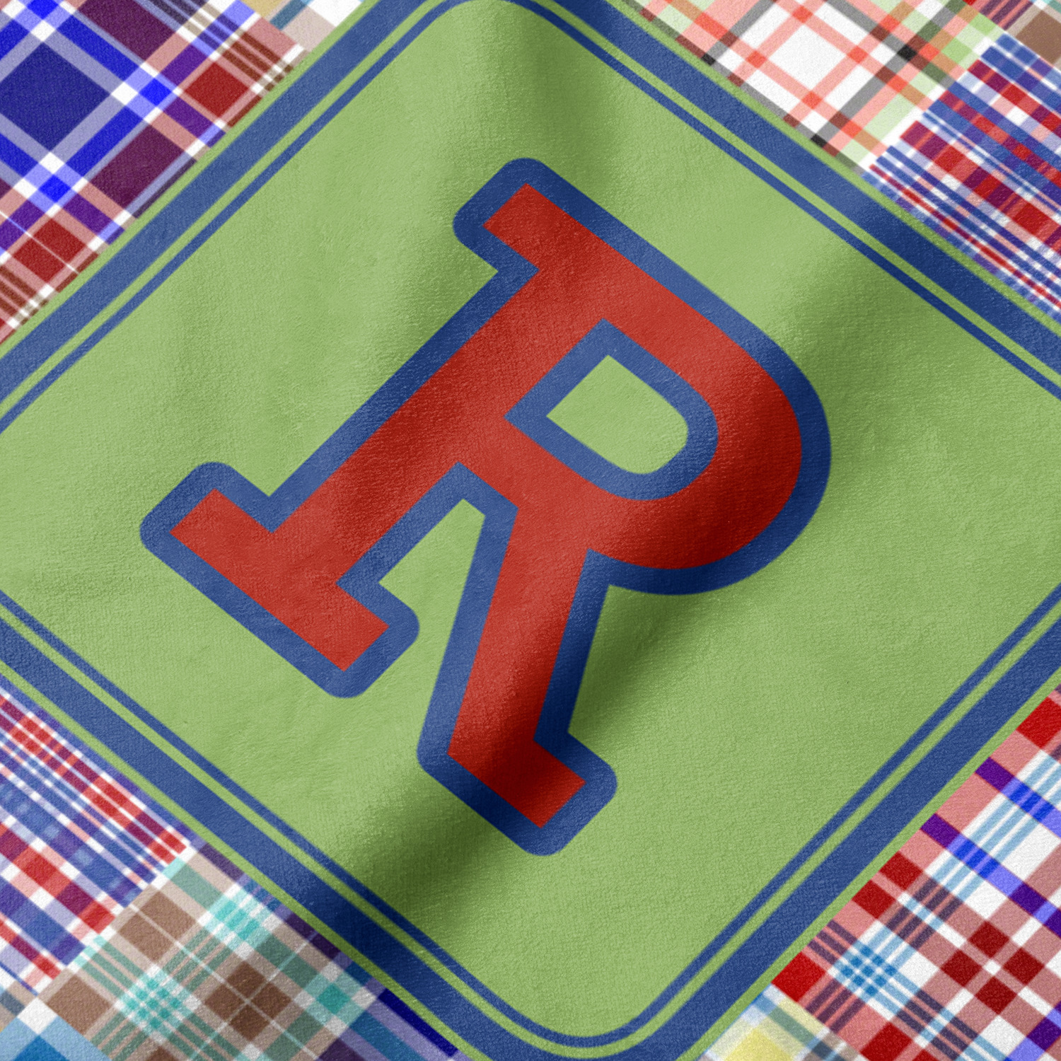 A square label is the perfect place for your initial, to make this collection of plaids truly you.