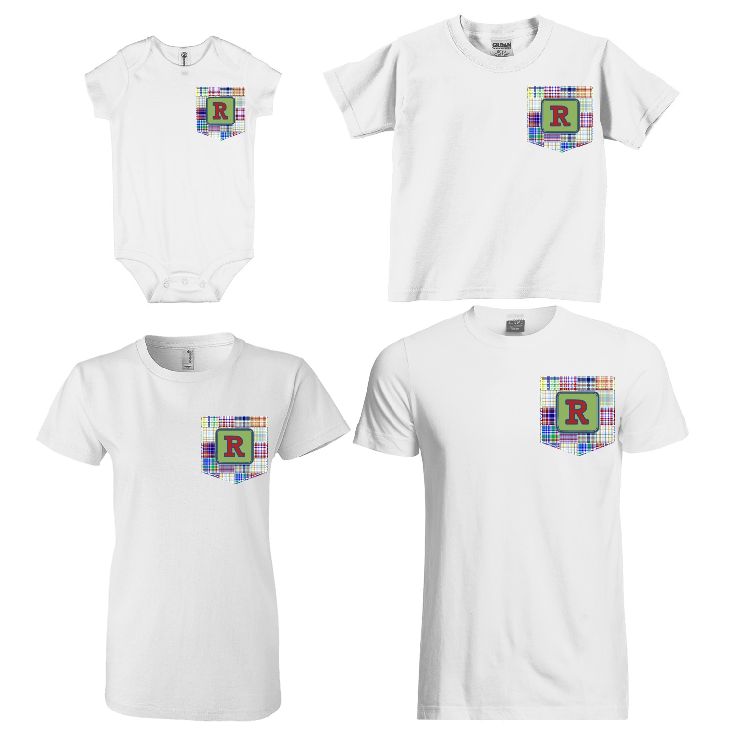 The faux pockets are available in 4 different sizes - for baby, kids, youth/women & men; the whole family can have the same pocket design, but sized just for them! The pockets are printed using our direct-to-film technology to the exact shape & size. We have faux stitching around the pocket, with double stitching on the top of the pocket to give it the authentic pocket look!