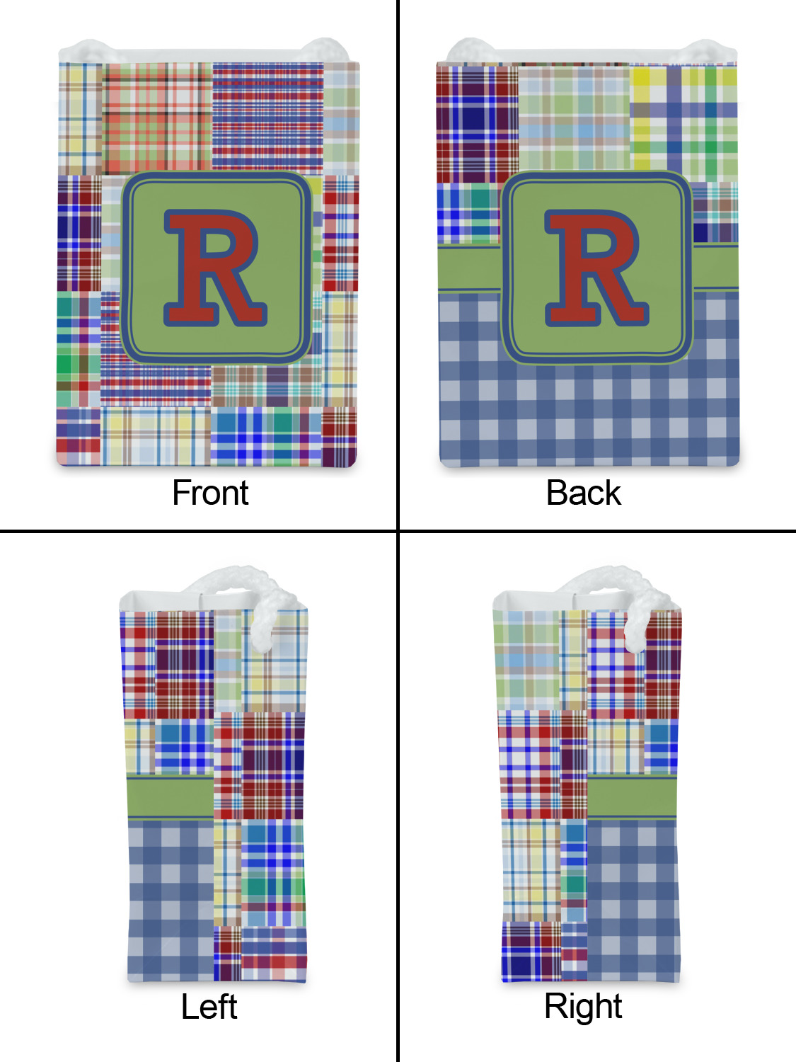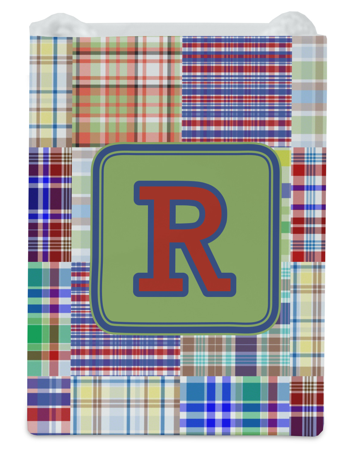 A square label is the perfect place for your initial, to make this collection of plaids truly you.