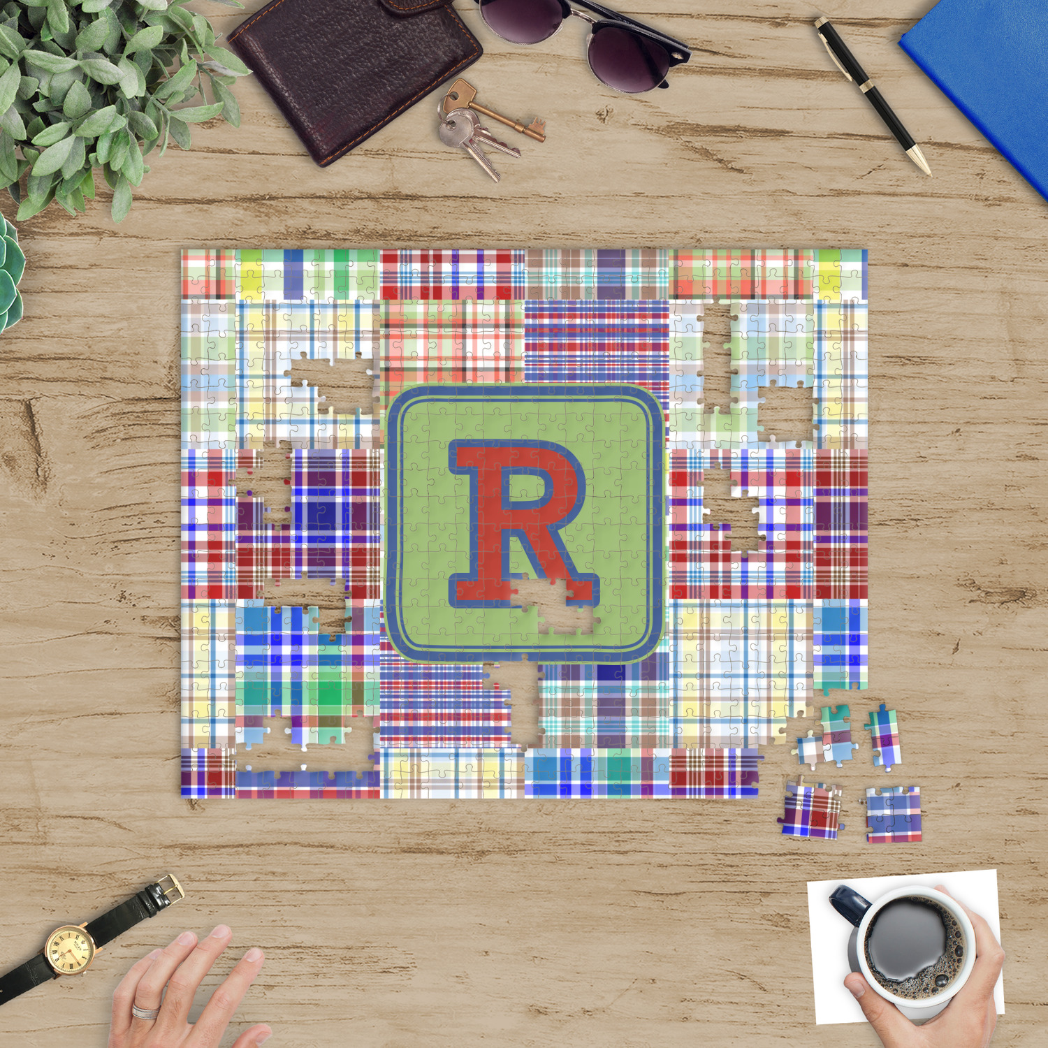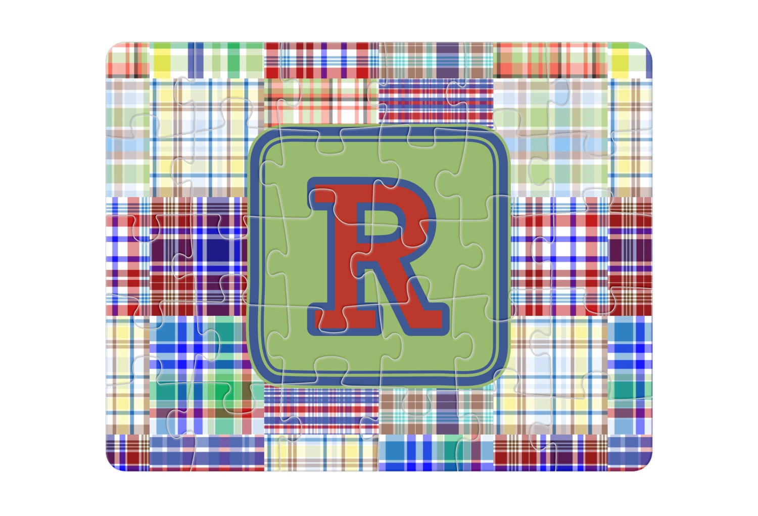 A square label is the perfect place for your initial, to make this collection of plaids truly you.