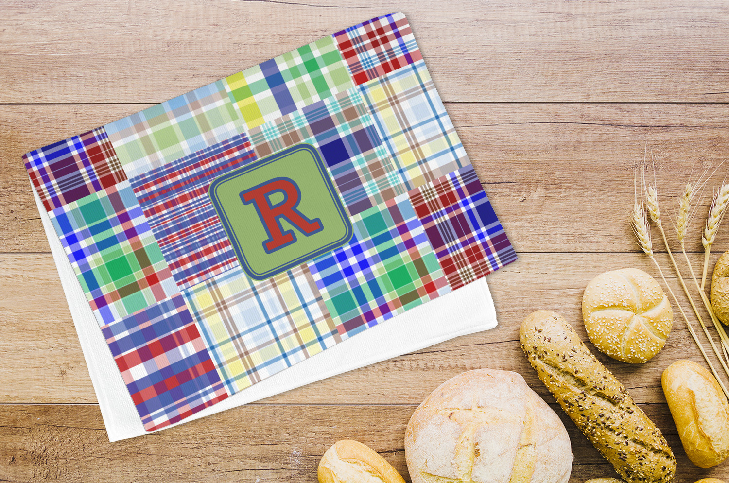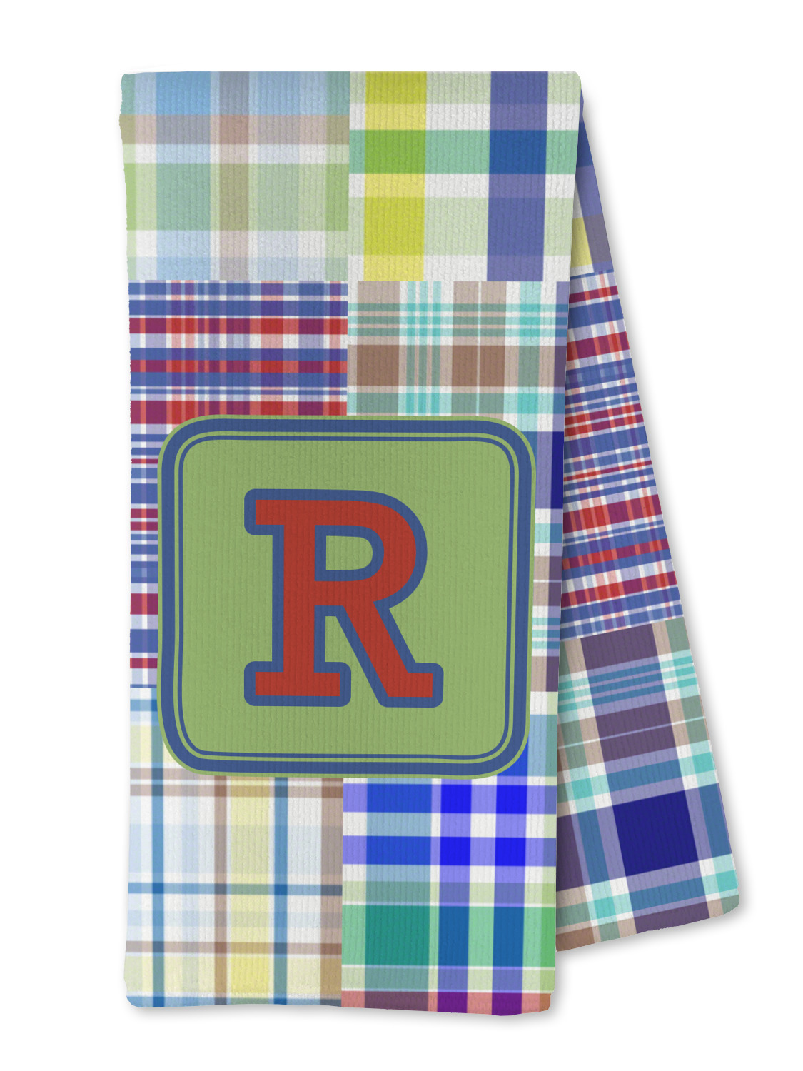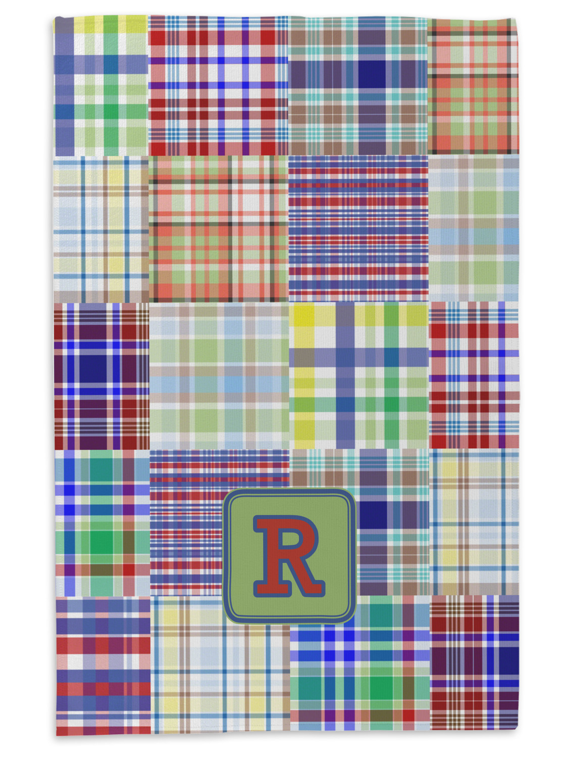 A square label is the perfect place for your initial, to make this collection of plaids truly you.