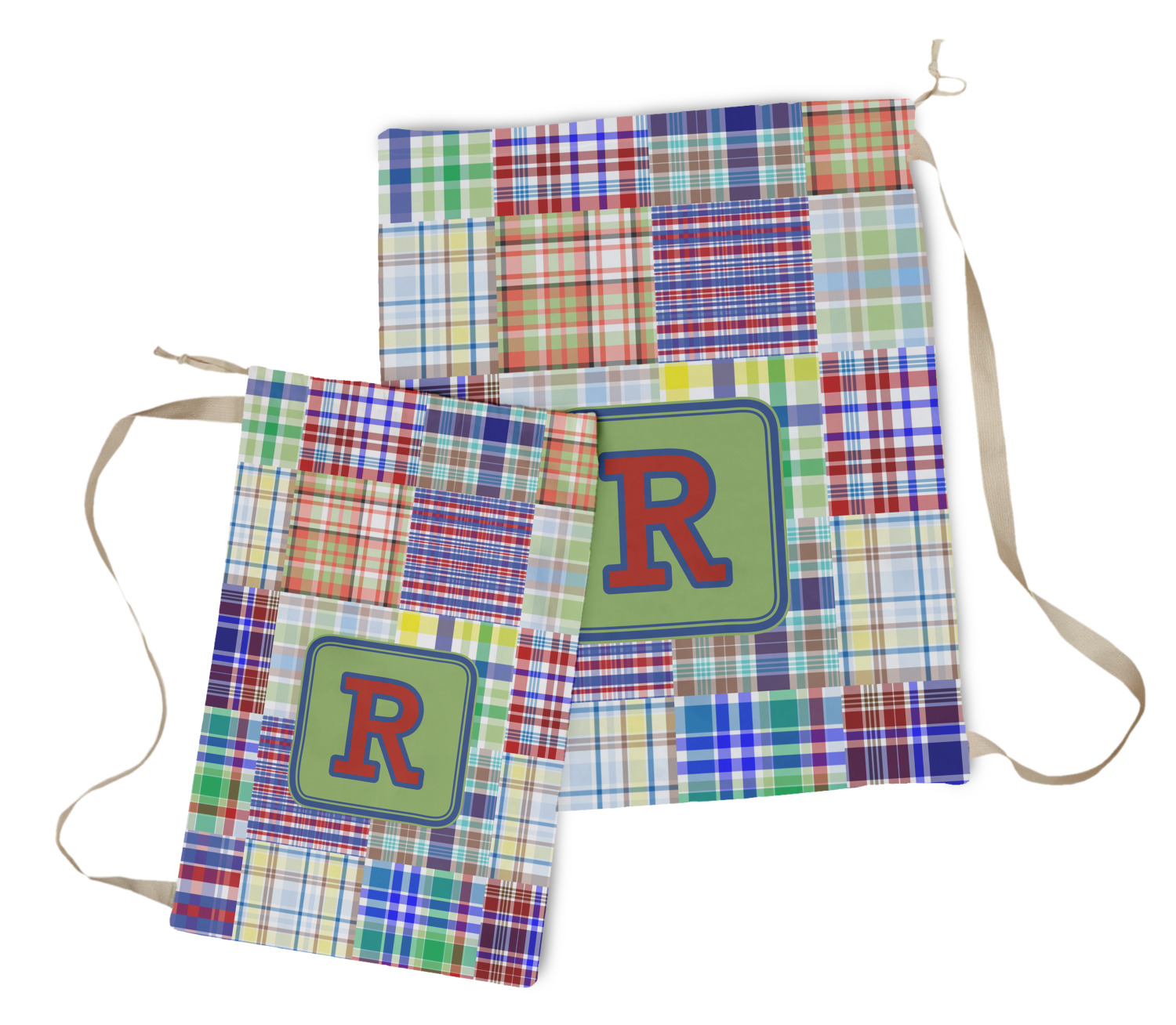 A square label is the perfect place for your initial, to make this collection of plaids truly you.
