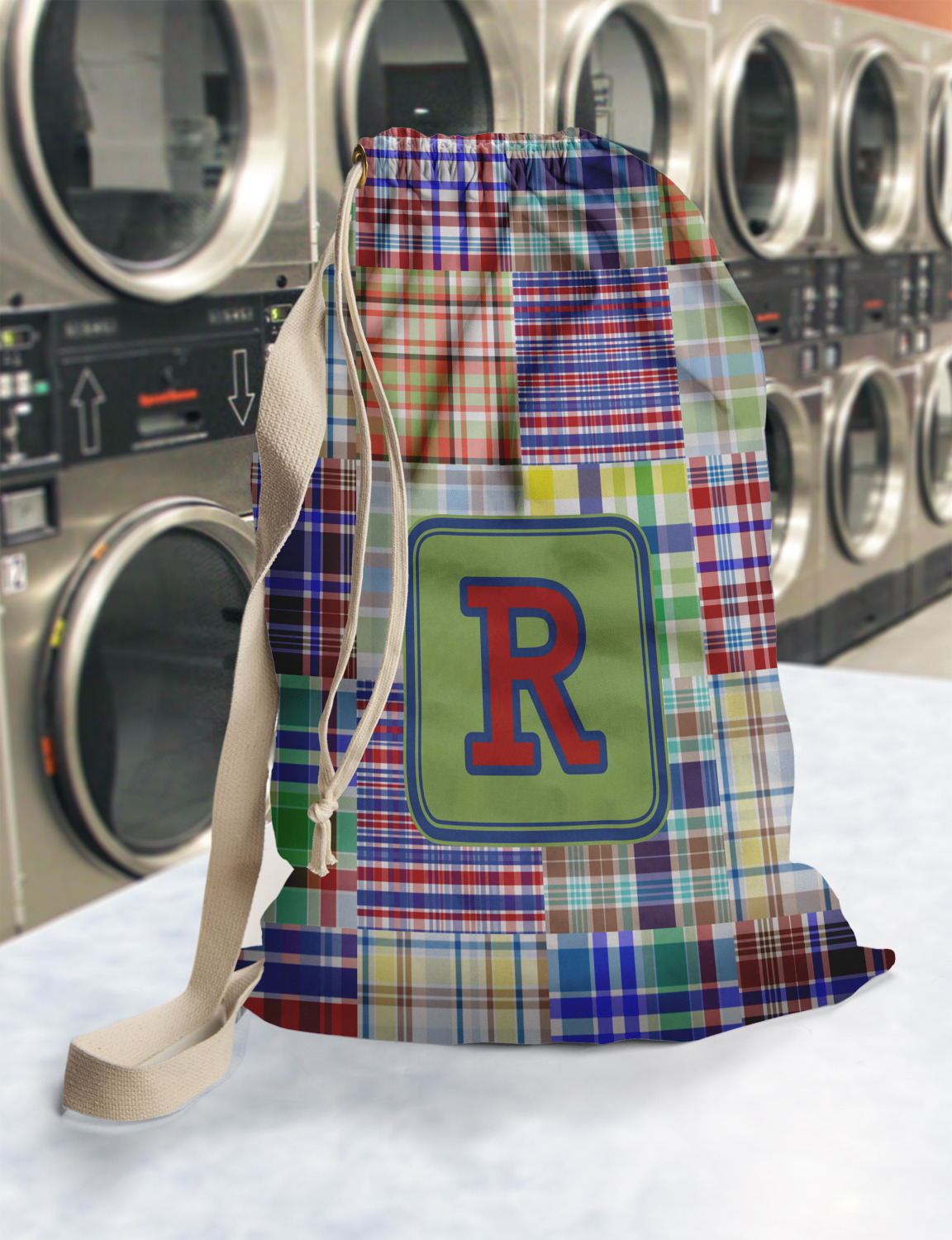 Carry your laundry in style with these customized laundry bags. Available in two sizes, featuring a natural colored woven strap and a cinch cord, these bags hold a lot of clothes or anything else you want to fit in them.