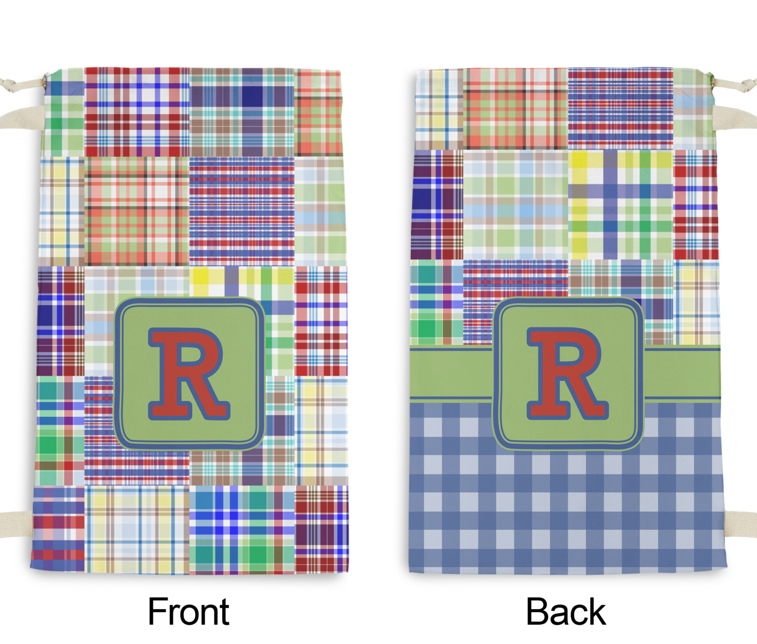A square label is the perfect place for your initial, to make this collection of plaids truly you.