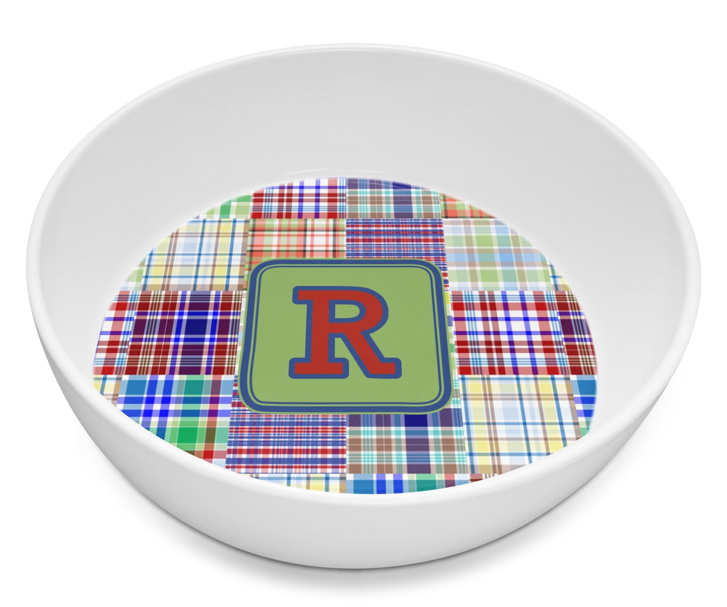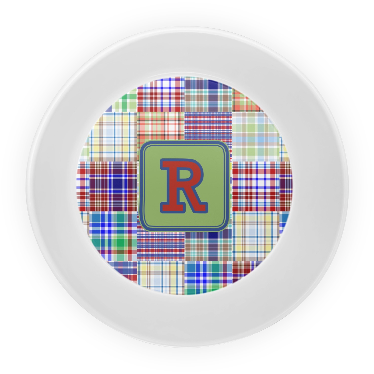 A square label is the perfect place for your initial, to make this collection of plaids truly you.