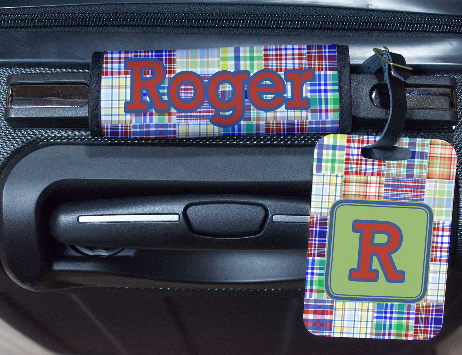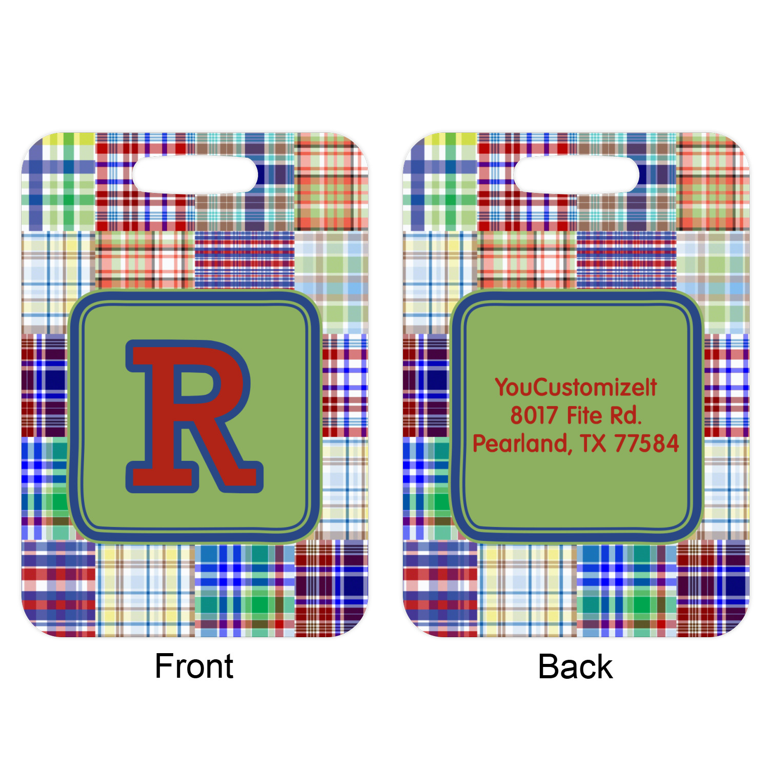 A square label is the perfect place for your initial, to make this collection of plaids truly you.