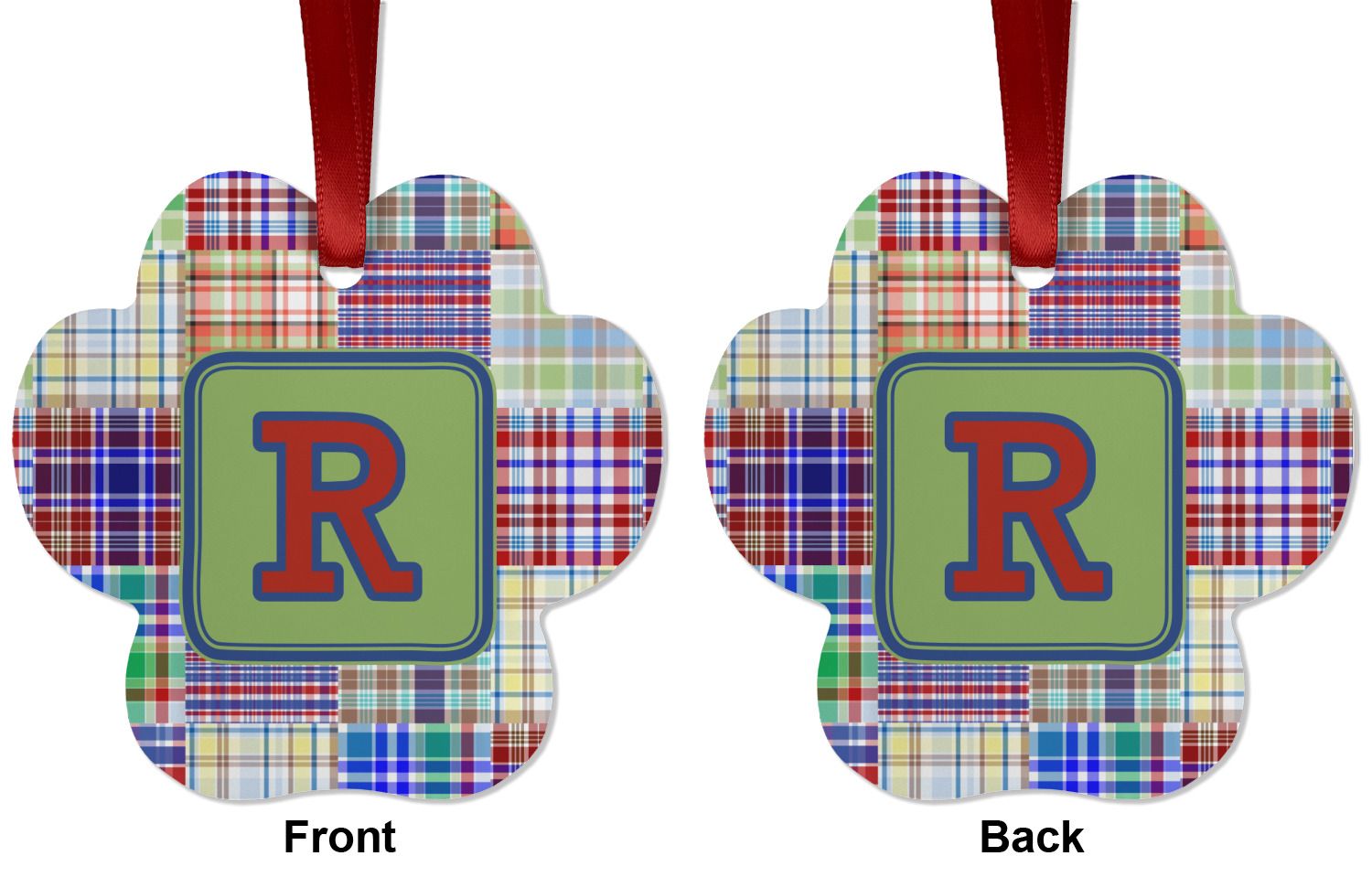 A square label is the perfect place for your initial, to make this collection of plaids truly you.