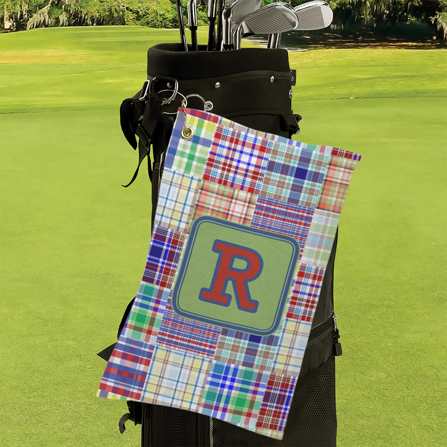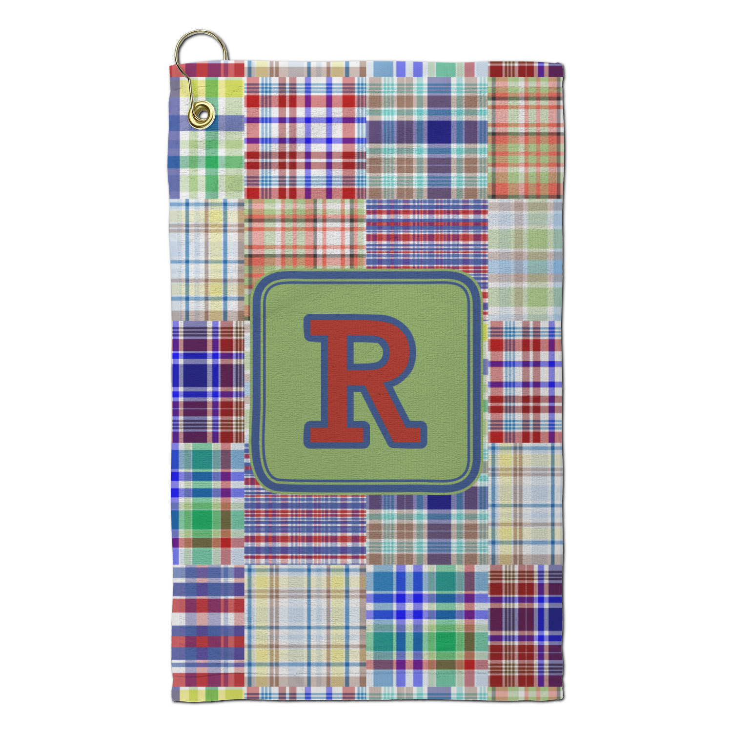 A square label is the perfect place for your initial, to make this collection of plaids truly you.