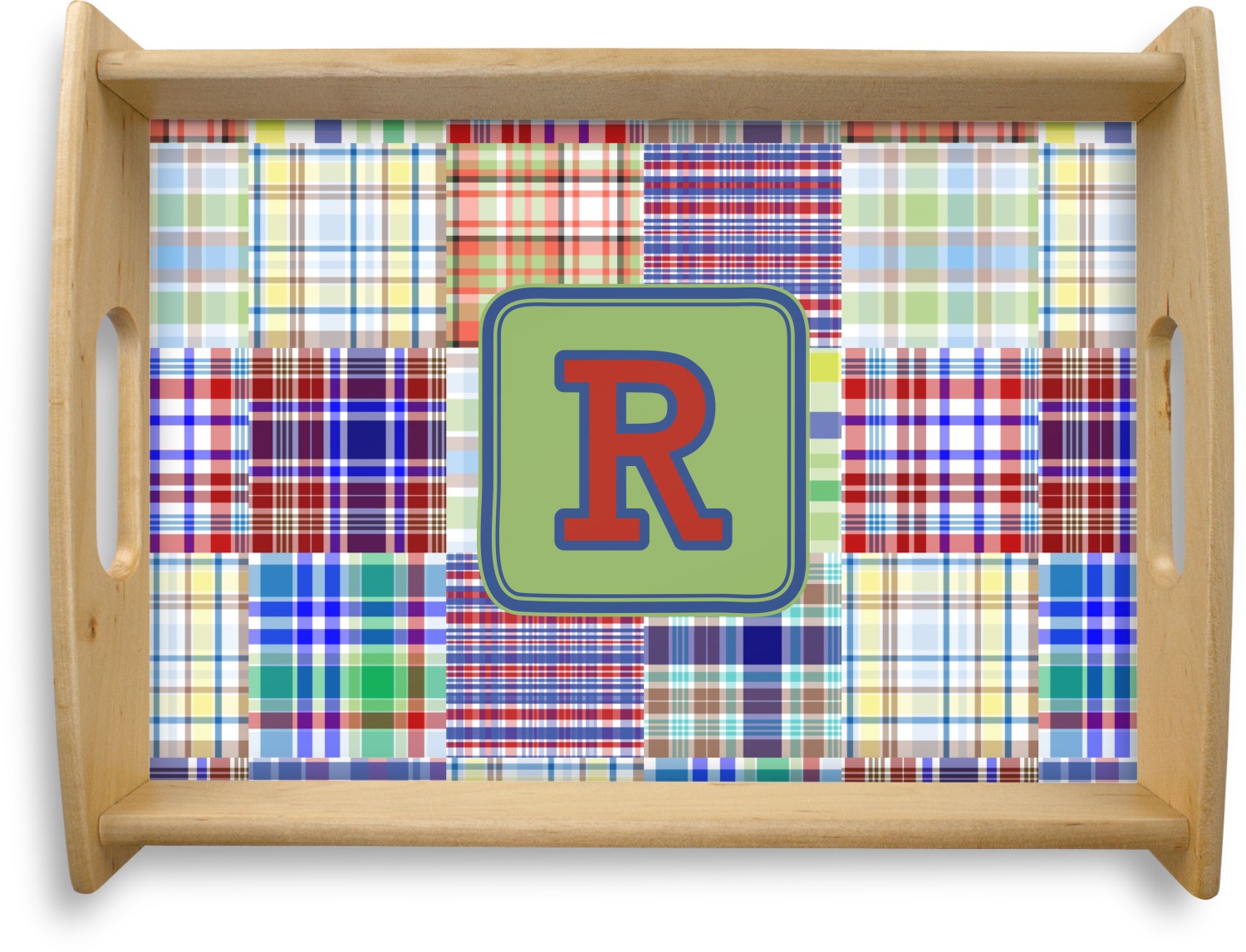 A square label is the perfect place for your initial, to make this collection of plaids truly you.