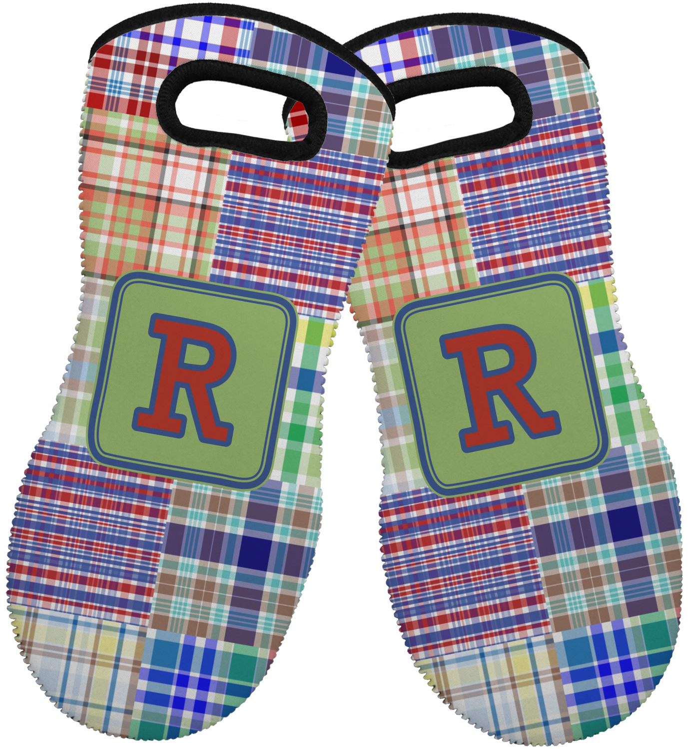 A square label is the perfect place for your initial, to make this collection of plaids truly you.