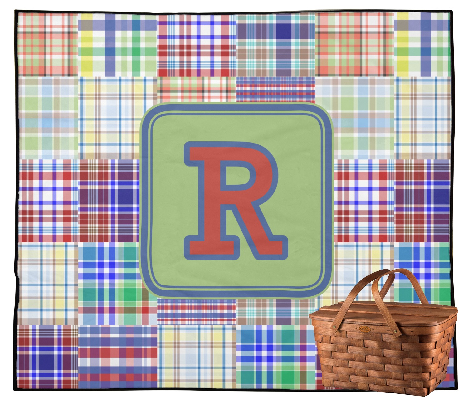 A square label is the perfect place for your initial, to make this collection of plaids truly you.