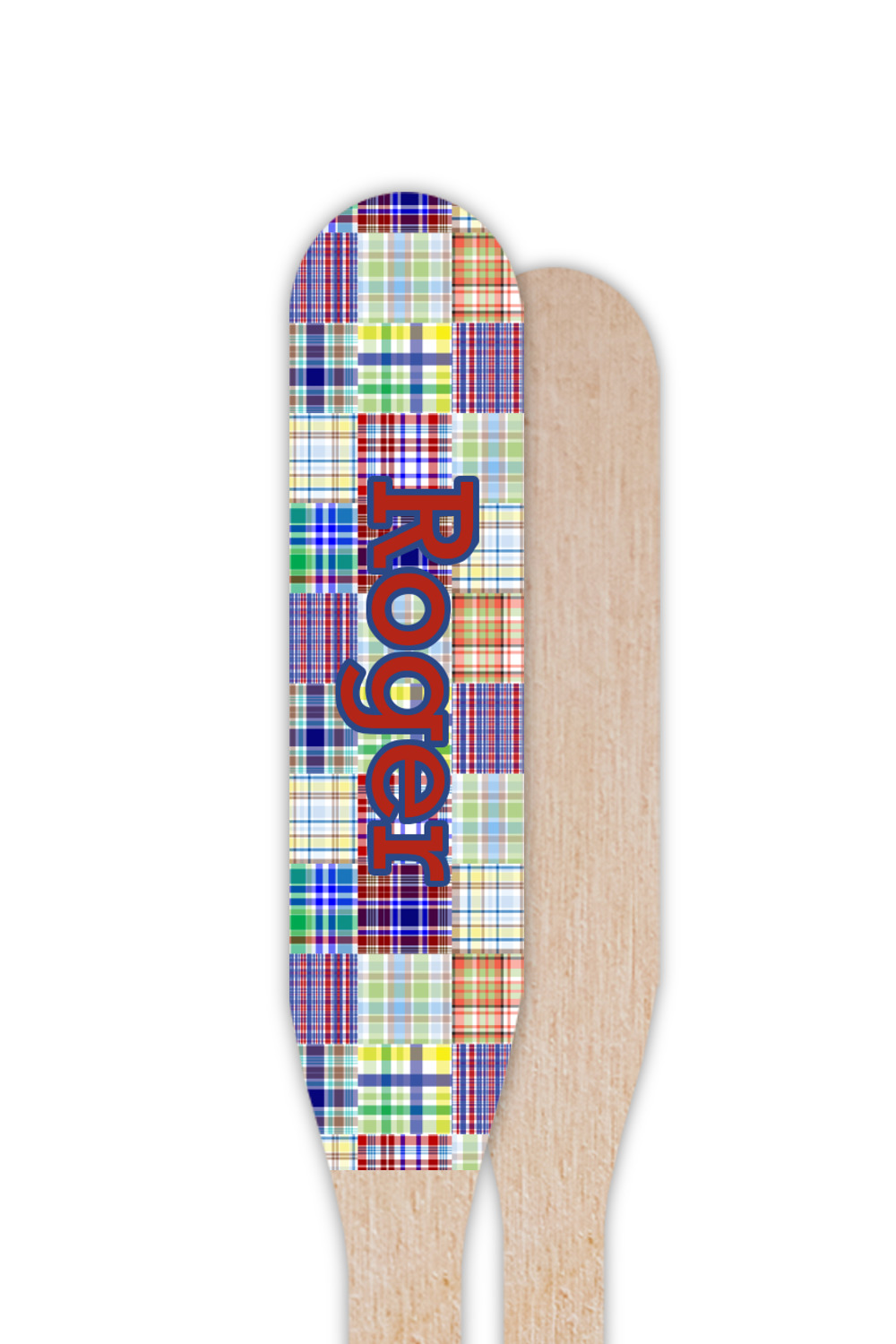 A square label is the perfect place for your initial, to make this collection of plaids truly you.