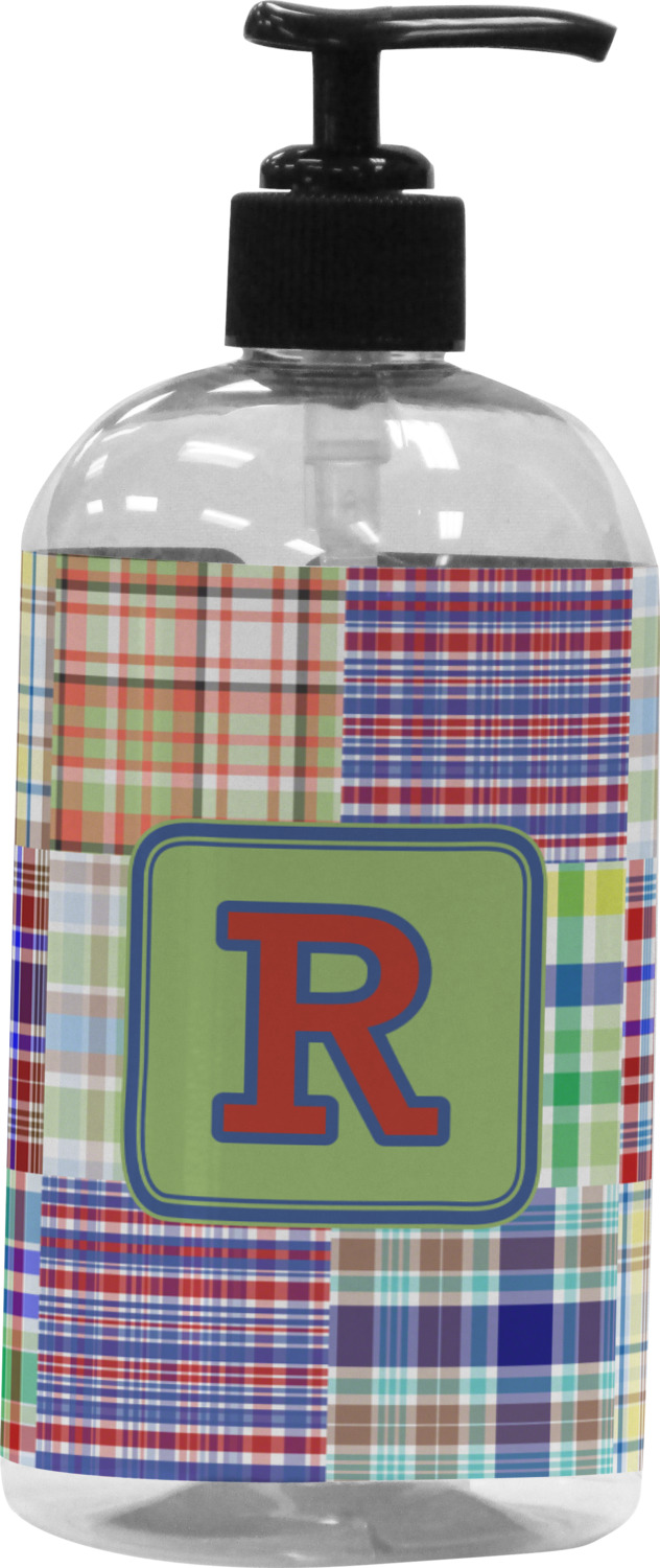 A square label is the perfect place for your initial, to make this collection of plaids truly you.