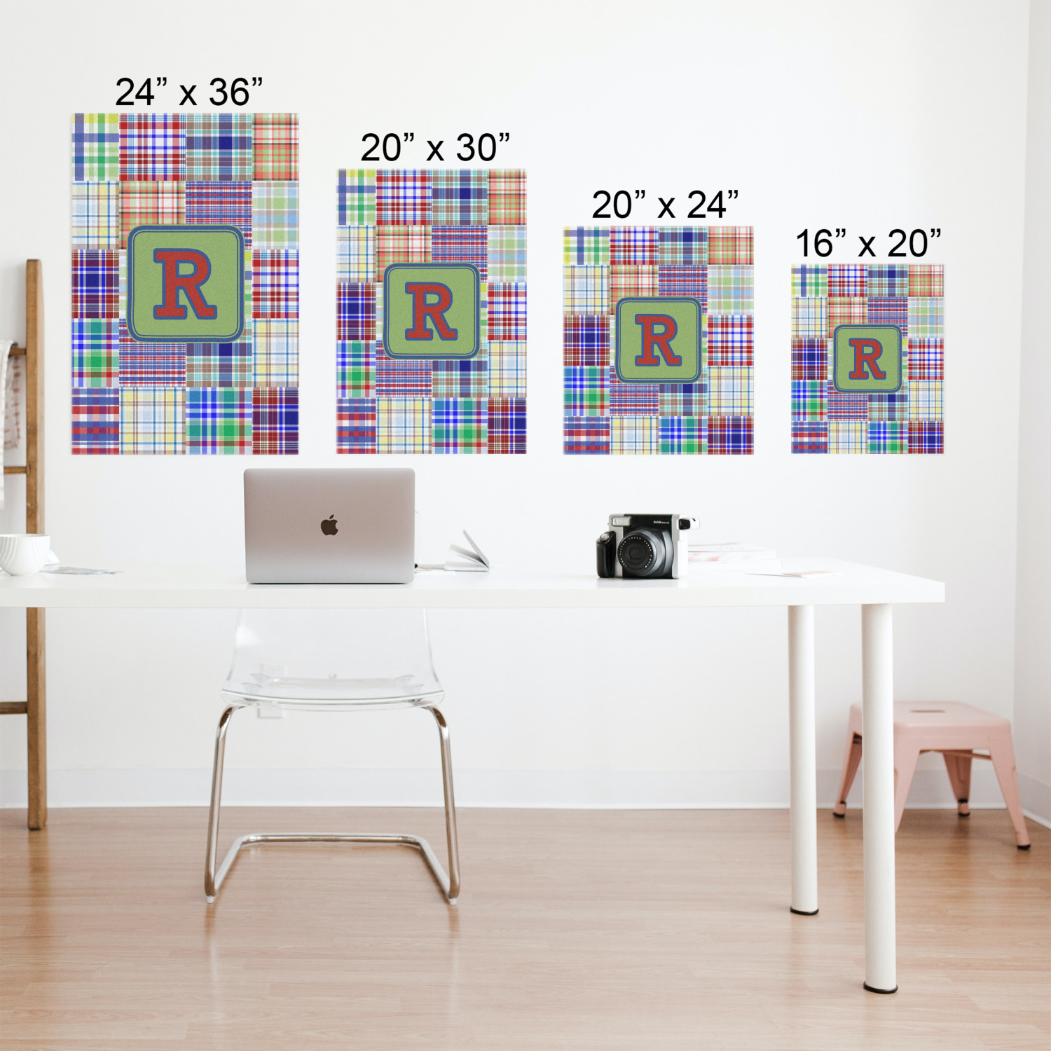 A square label is the perfect place for your initial, to make this collection of plaids truly you.