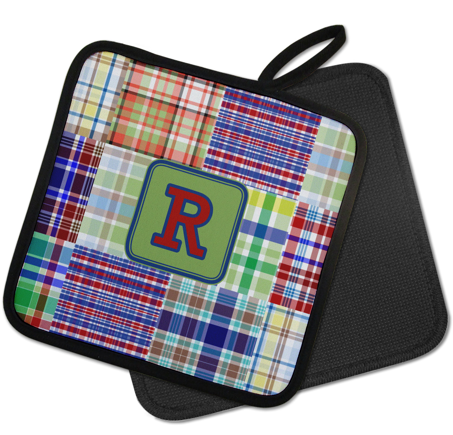 Our personalized pot holders feature a neoprene front that displays your personalization in vibrant colors. The backing of the hot pot holder is rubberized; the textured backing allows you to have a great grip when using this custom pot holder. The two materials are joined with a sleek, black trim, and the holder also includes an attached loop for hanging and storage. The pot holder is approximately 8.75 inches by 8.75 inches and 0.25 inches tall, while the fabric loop is 2.5 inches long. You can purchase a kitchen pot holder by itself or as a set of 2. We also offer a set including one pot holder and one oven mitt.