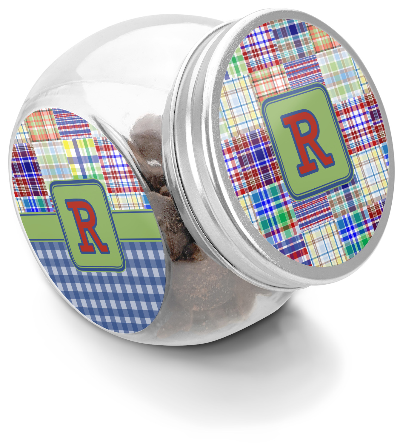 A square label is the perfect place for your initial, to make this collection of plaids truly you.