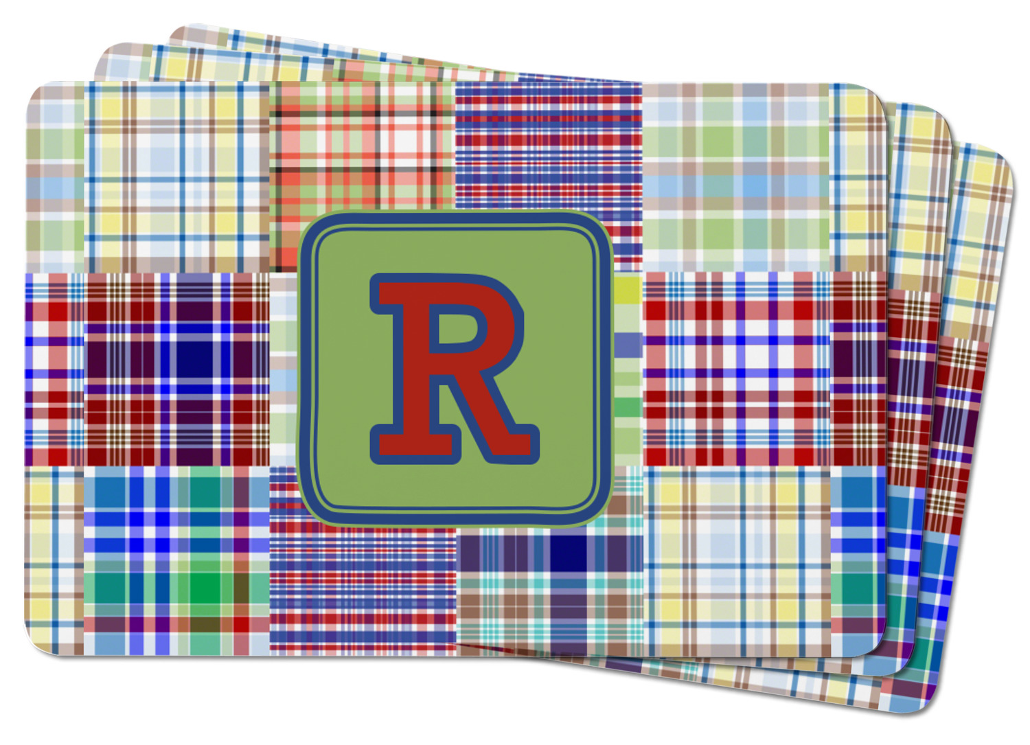 A square label is the perfect place for your initial, to make this collection of plaids truly you.