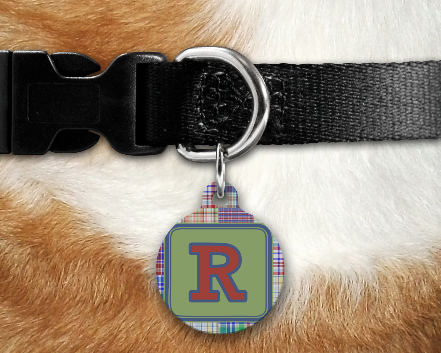 A square label is the perfect place for your initial, to make this collection of plaids truly you.