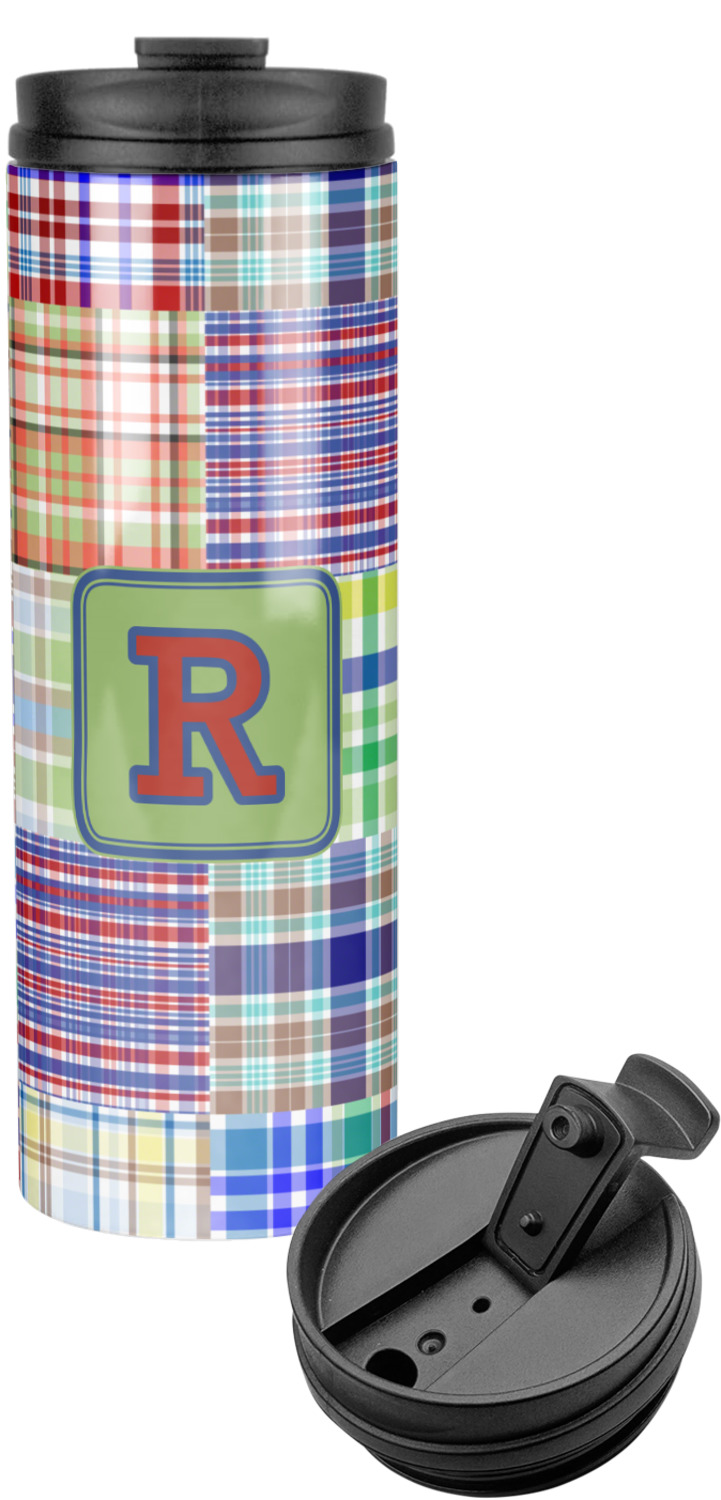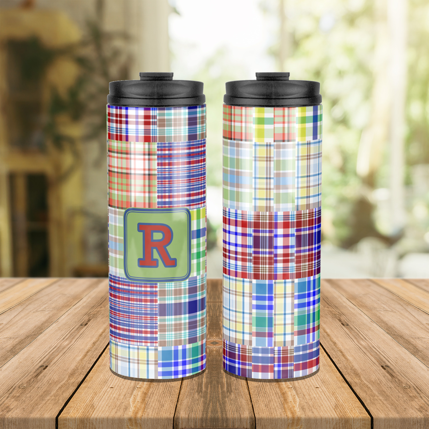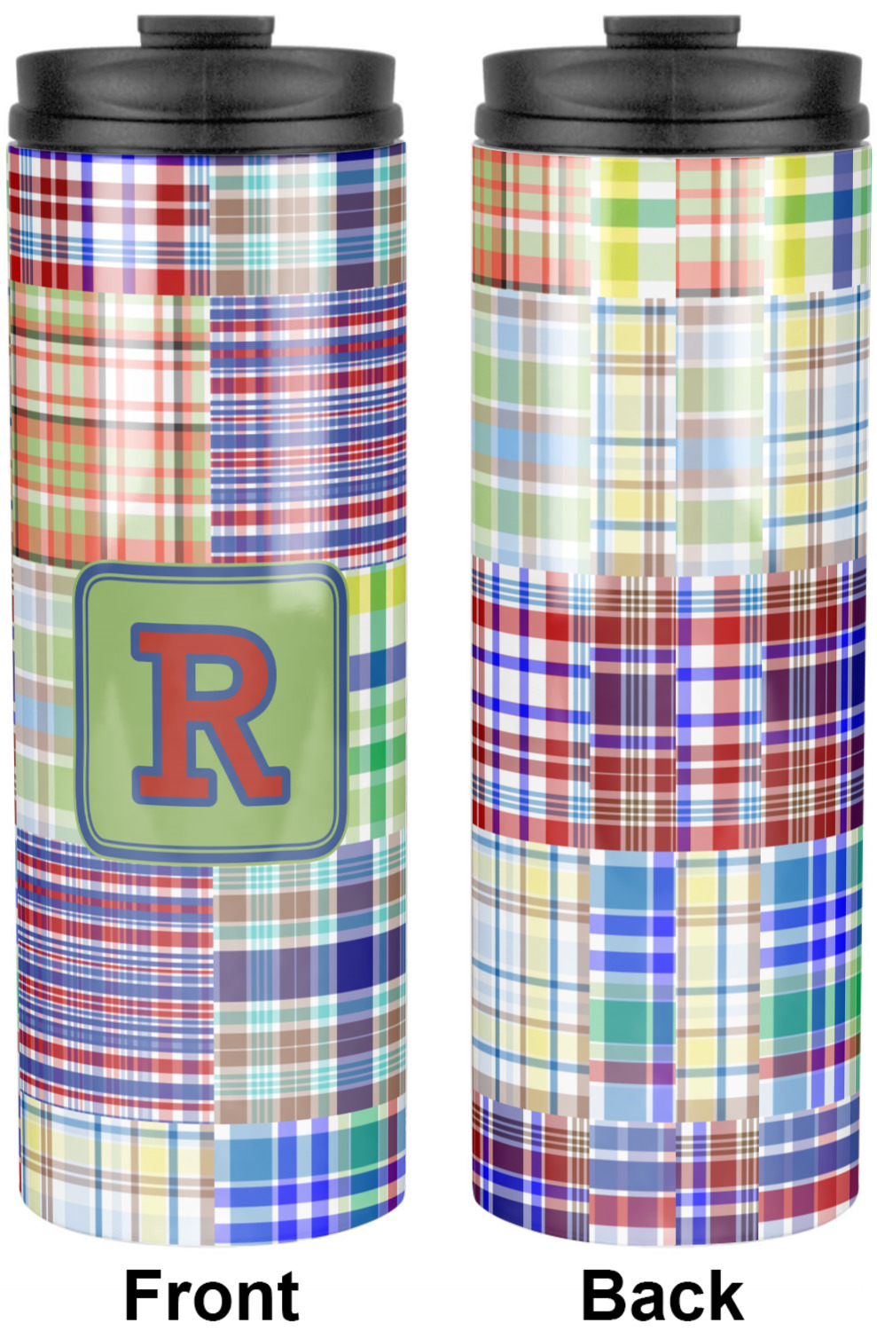 A square label is the perfect place for your initial, to make this collection of plaids truly you.