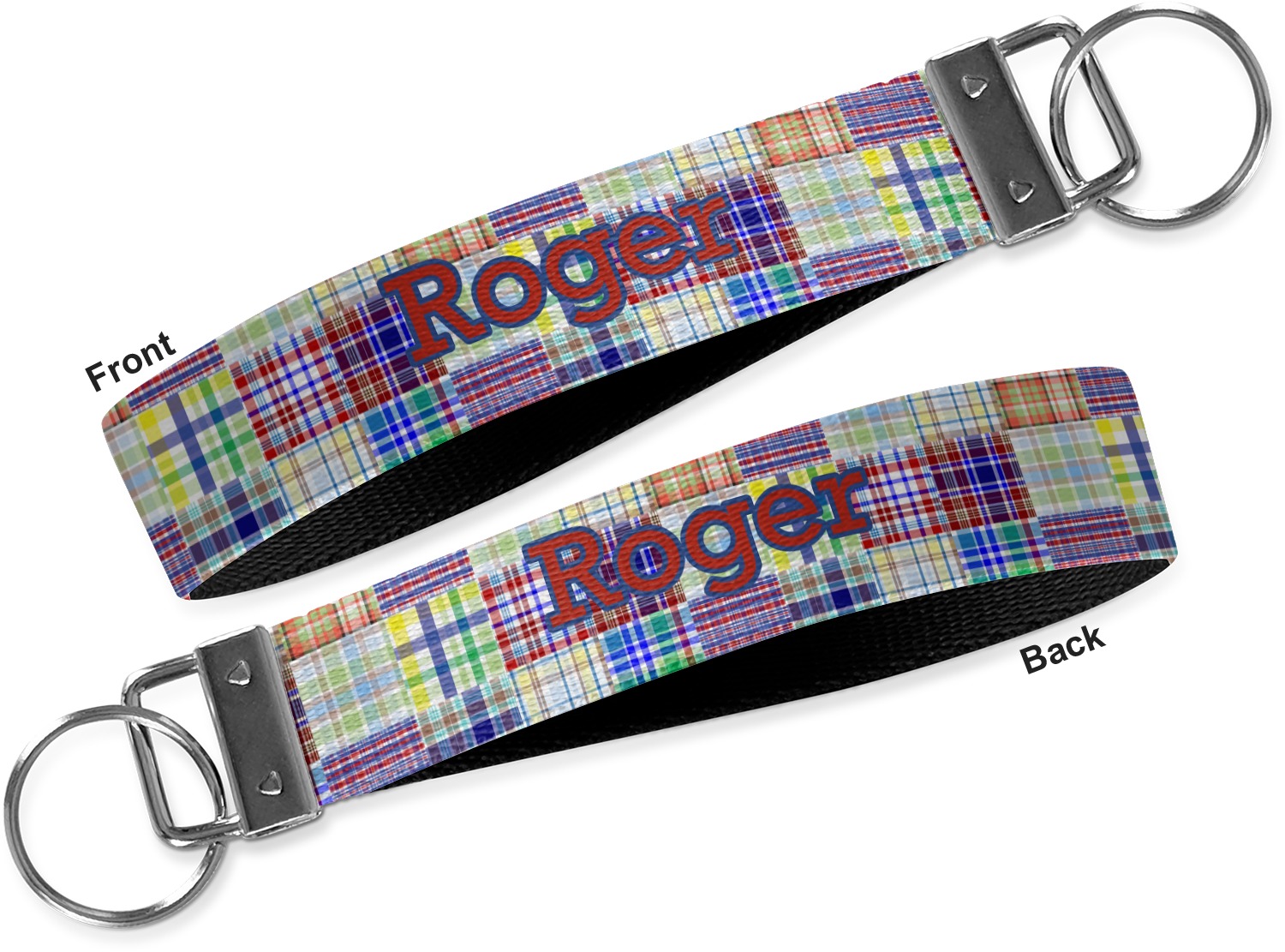These key fob keychains are made from a polyester weave, right here in the USA. They feature a silver, metal clasp, attached to a round keyring. The piece gives the personalized wristlet a beautiful, finished look. Your customized design is printed on the outside of the keychain strap. We carry these wristlets in two sizes: small, which is 5 inches in width, and large, which is 5.5 inches in width.