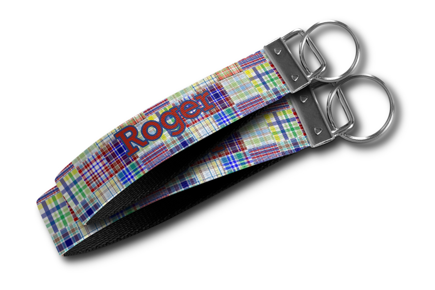 These key fob keychains are made from a polyester weave, right here in the USA. They feature a silver, metal clasp, attached to a round keyring. The piece gives the personalized wristlet a beautiful, finished look. Your customized design is printed on the outside of the keychain strap. We carry these wristlets in two sizes: small, which is 5 inches in width, and large, which is 5.5 inches in width.