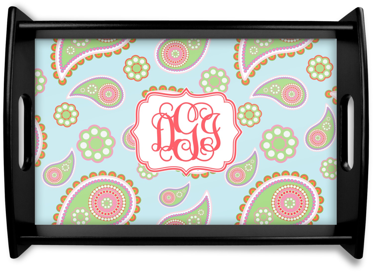 This serving tray with handles features square edges and two rounded sides, creating a very modern look. Each side is fabricated from a beautifully cut, natural wood. The bottom of the interior of the tray displays your customized design in bright, vibrant color. The tray is sold in both a black color and a natural wood look. Each variation of the wood serving tray has two sizes: Small, which is 14" x 10" x 2.25", and Large, which is 19.5" x 13.5" x 2.75".