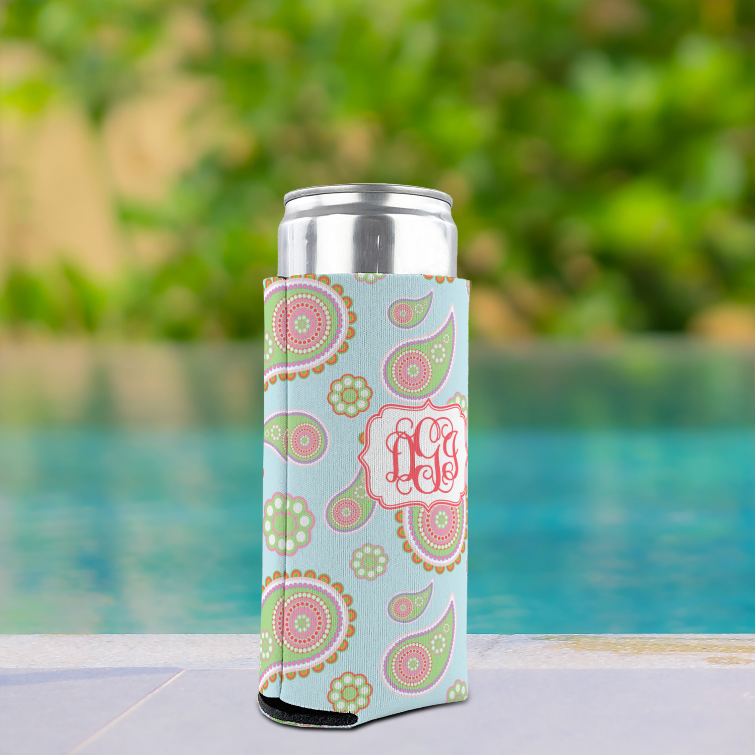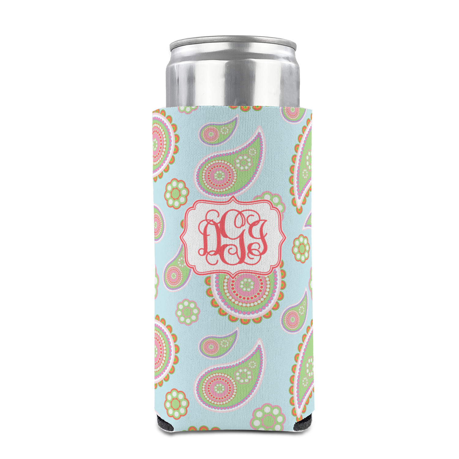 This design with paisley in green and coral on a blue background creates a nice balance between feminine and masculine colors.