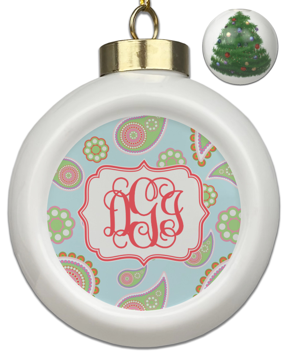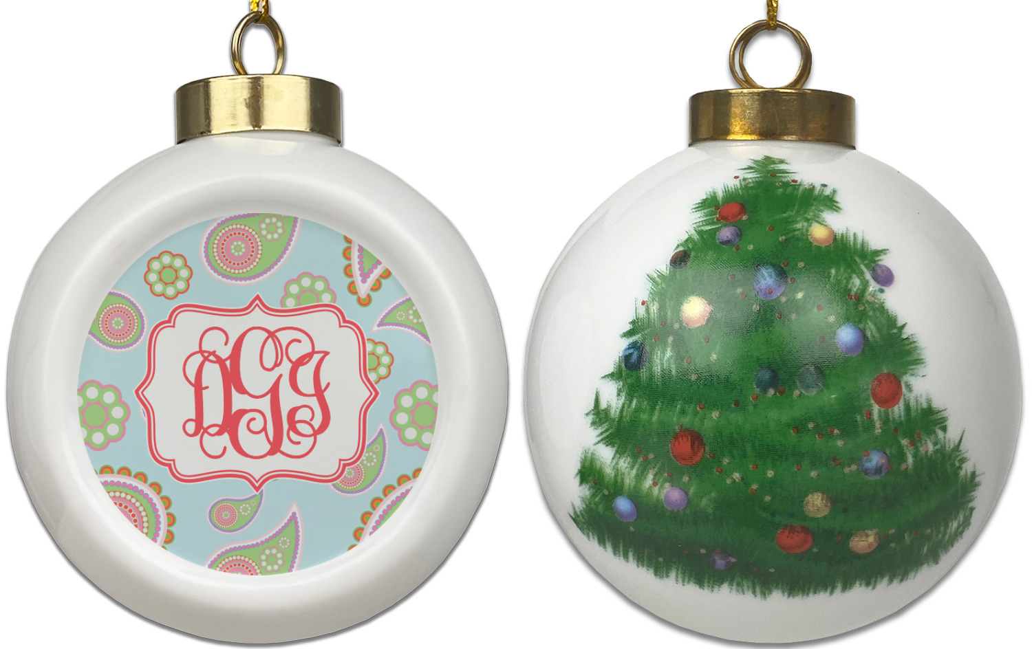 Our Christmas ornaments are a unique ceramic ball shape with a twist as it has a flat face to display your custom design! Select from one of our two design types - Christmas Tree or Poinsettia Garland - to adorn the curved back of your personal design. Each ornament measures 3H x 2.5W x 2D accompanied with a gold string accent for finishing touches to hang on your beautiful Christmas tree!