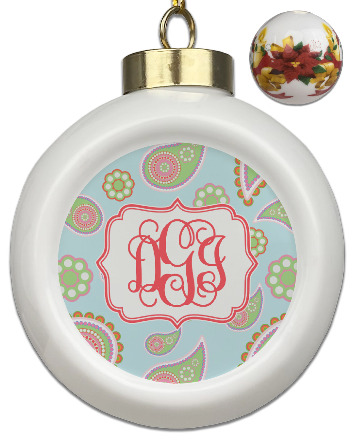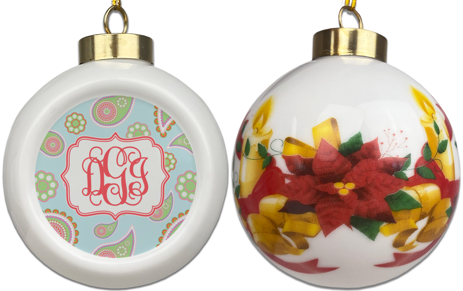 Our Christmas ornaments are a unique ceramic ball shape with a twist as it has a flat face to display your custom design! Select from one of our two design types - Christmas Tree or Poinsettia Garland - to adorn the curved back of your personal design. Each ornament measures 3H x 2.5W x 2D accompanied with a gold string accent for finishing touches to hang on your beautiful Christmas tree!