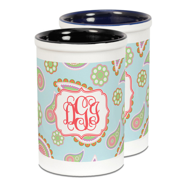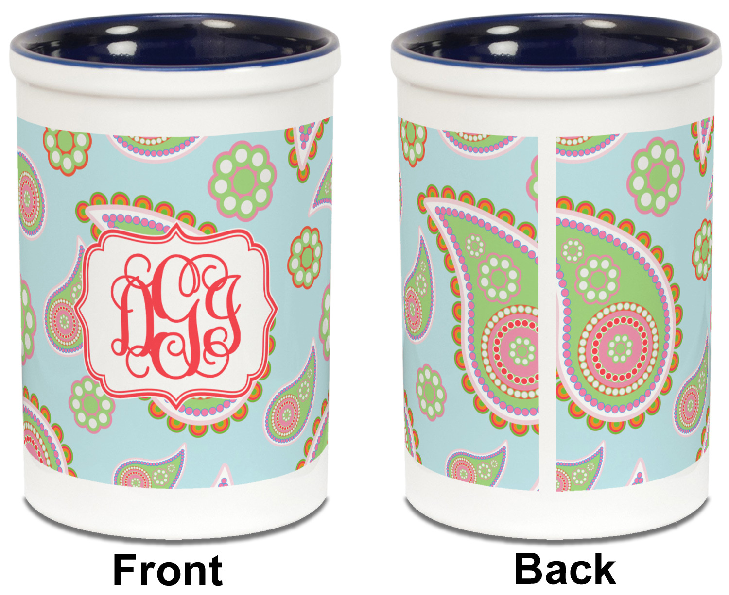 Both the blue and black pencil holders are a ceramic material, giving you a sturdy and long-lasting pen and pencil holder. We print your designs on the exterior of the pencil cup, covering most of the outside surface. There is a small white border on the top and bottom of the exterior of the pen holder, setting apart your design from the interior's color. Our ceramic pen caddy is roughly 3.5" x 3.5" x 5" in dimensions.