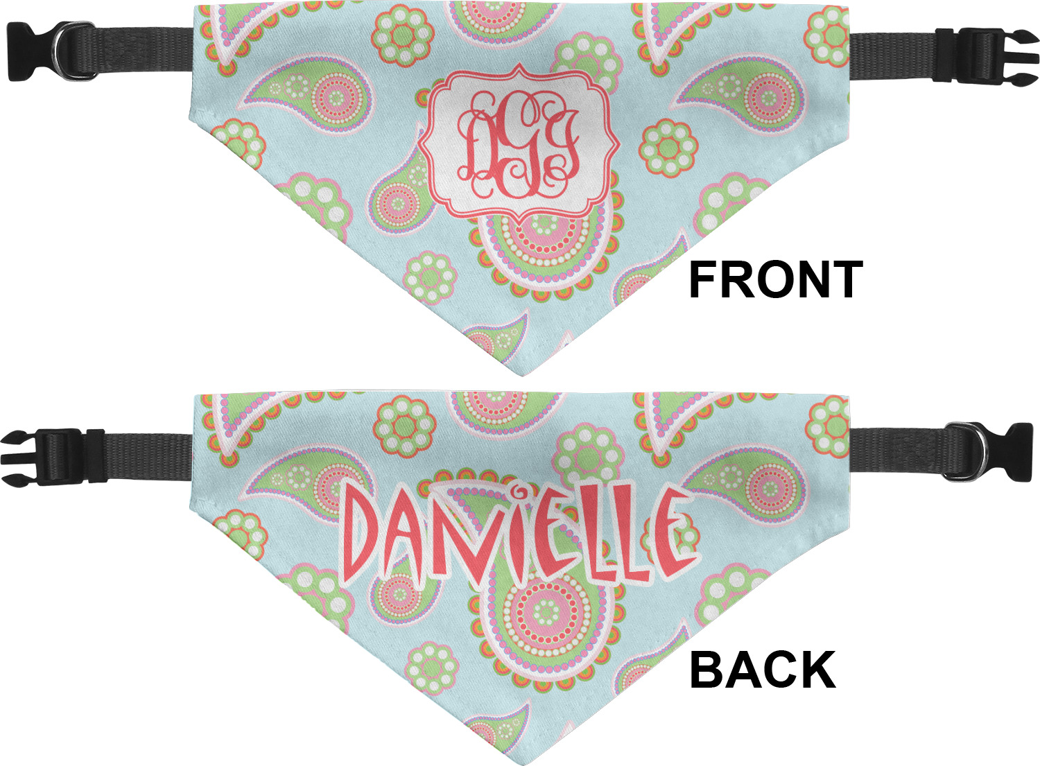 We print the front and back of these dog bandanas with your customized design. The bandana itself is made from a durable polyester, sewn together with a gap large enough to accommodate any collar. Regardless, the bandana includes a plain black, canvas collar with plastic snaps, that can easily be removed if desired. These dog bandana collars are available in four sizes: small, medium, large, and extra large. Please see our sizing chart for more information regarding the dimensions of each size.
