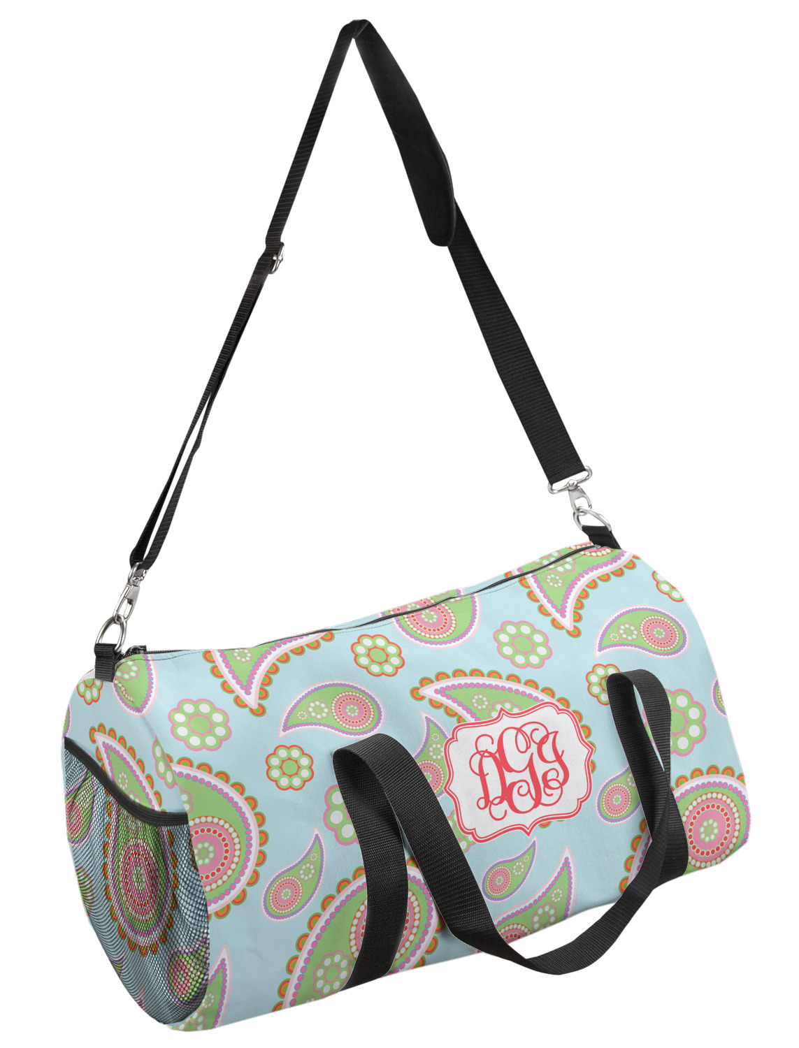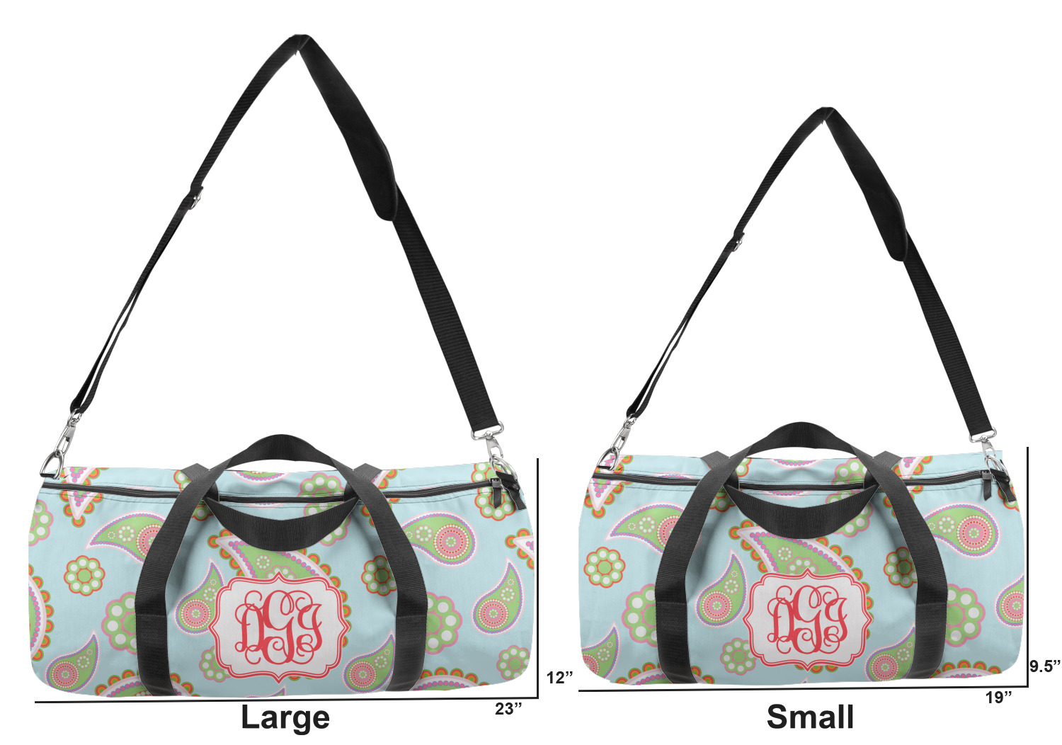 This duffle is a sturdy bag made of a canvas material. It comes in two sizes: Small (19"W x 9.5"H x 9.5"D) and Large (23"W x 12"H x 12"D). The bag is a cylindrical shape with a black adjustable strap and two handles. On one side is an elastic pouch to put a waterbottle or other small item. Your product will be sublimated with your design and is able to be designed on the front, back, and sides. Be sure to remember that the straps may cut into parts of your design if you upload your own artwork.
