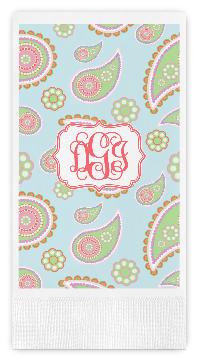 This design with paisley in green and coral on a blue background creates a nice balance between feminine and masculine colors.