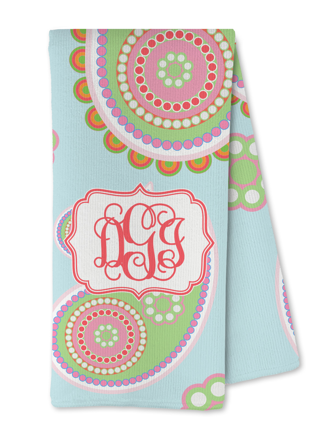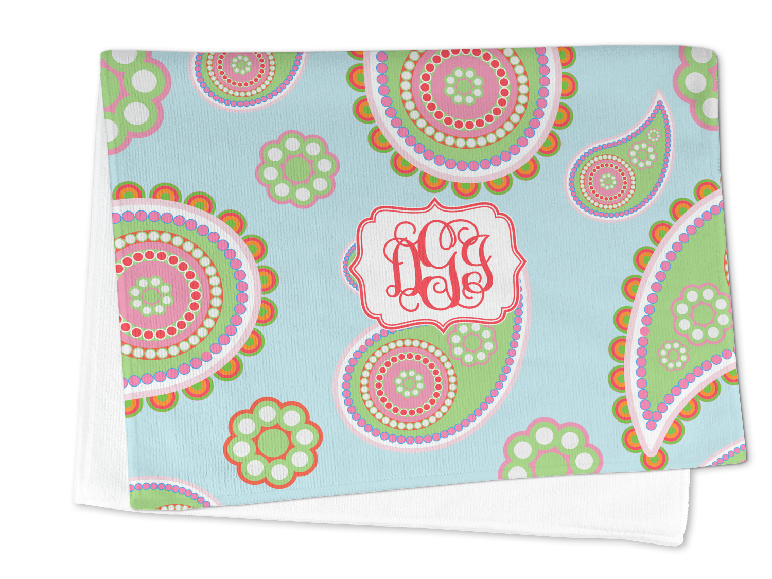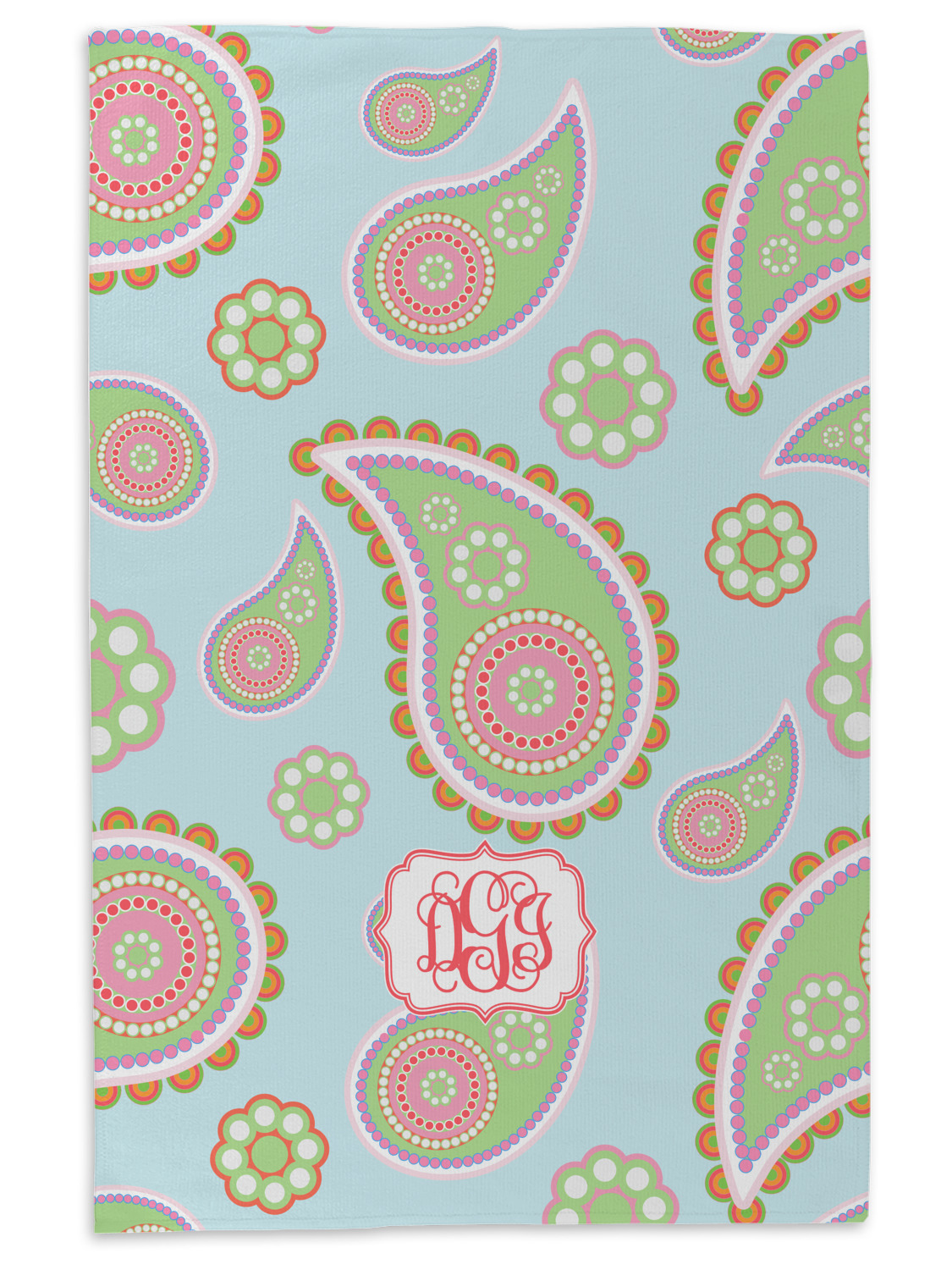 This design with paisley in green and coral on a blue background creates a nice balance between feminine and masculine colors.