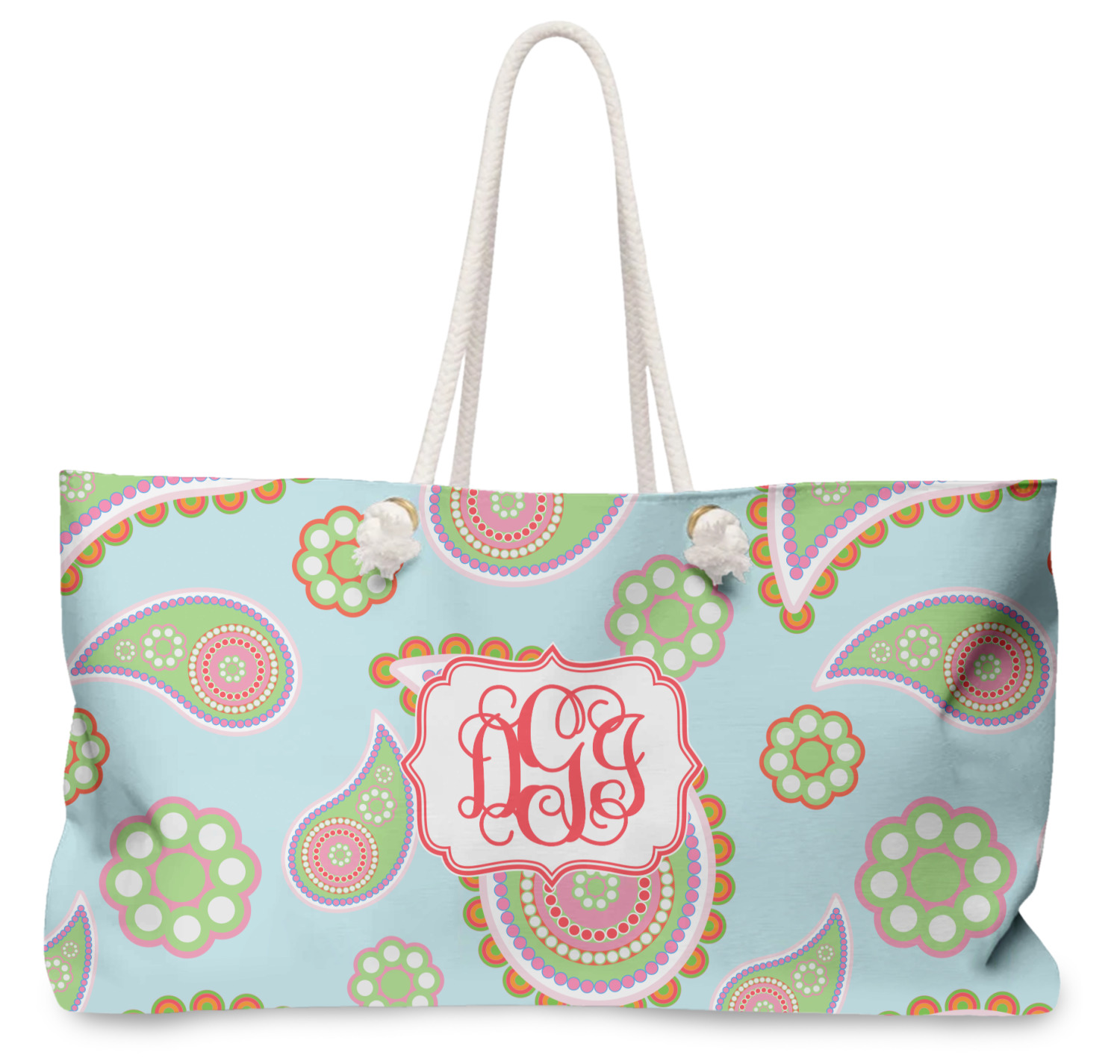 Our oversized weekender tote with rope handles is perfect for your weekend at the beach or on the town. This large tote are 24" W X 13" H, with a 5" gusset and a 27" thick rope handles with a knot that is put through a grommeted brass hole.