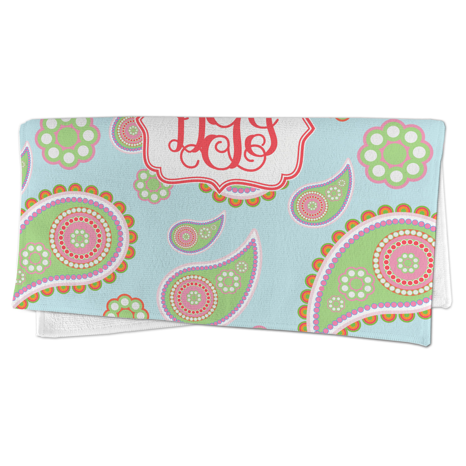 This design with paisley in green and coral on a blue background creates a nice balance between feminine and masculine colors.