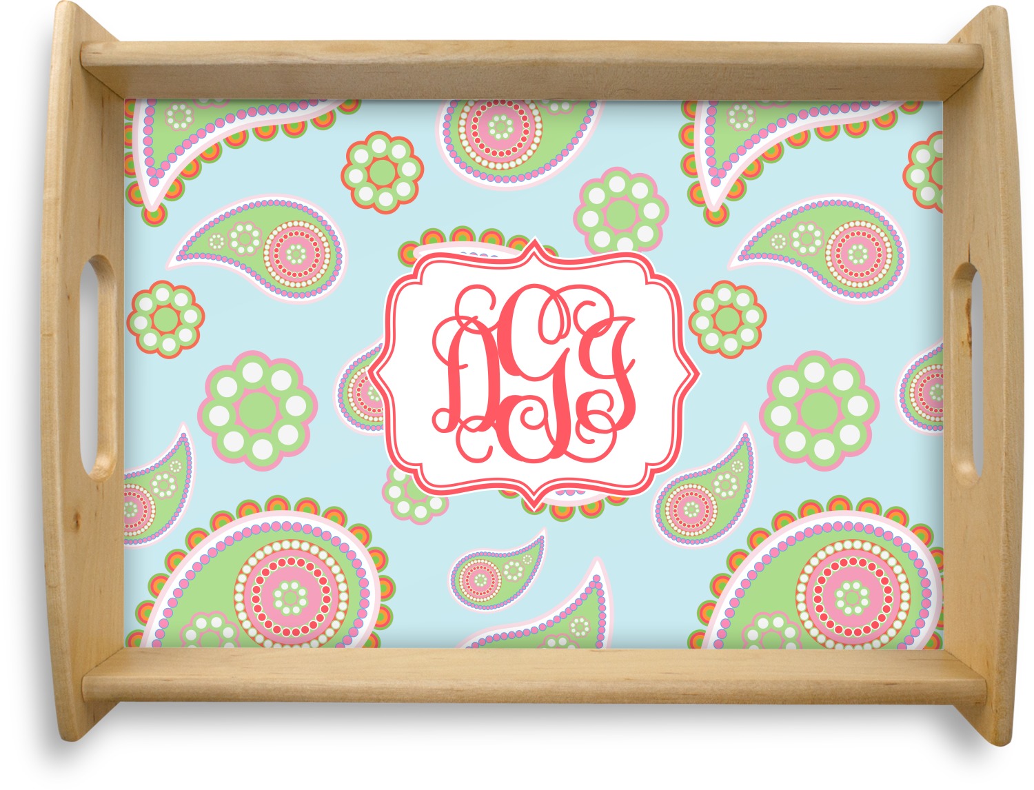 This serving tray with handles features square edges and two rounded sides, creating a very modern look. Each side is fabricated from a beautifully cut, natural wood. The bottom of the interior of the tray displays your customized design in bright, vibrant color. The tray is sold in both a black color and a natural wood look. Each variation of the wood serving tray has two sizes: Small, which is 14" x 10" x 2.25", and Large, which is 19.5" x 13.5" x 2.75".