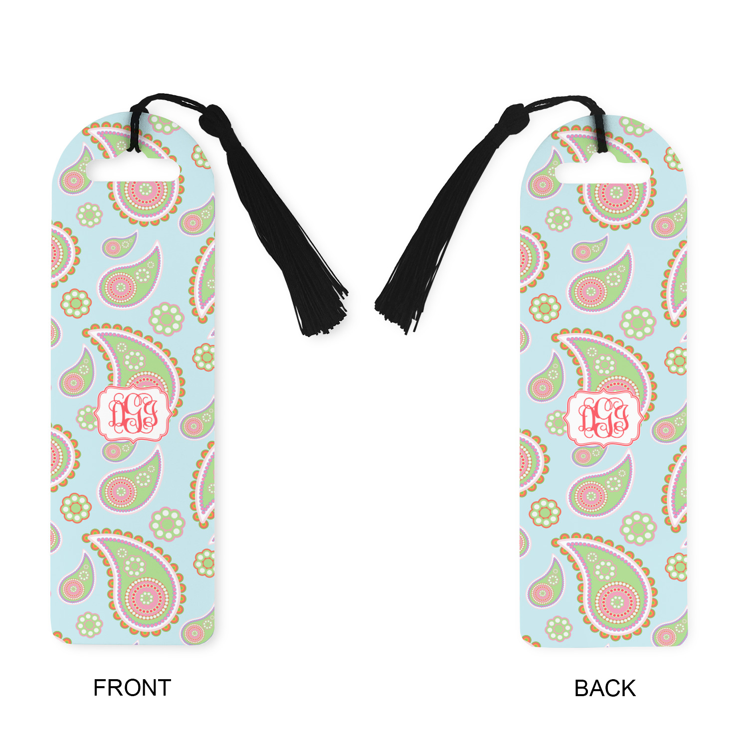 Made from a durable, flexible plastic, these bookmarks are printed with your custom design on them. With the tassel on them they make it easy to find your page in your book. These are a rectangular shape 7 1/4 inches tall with a rounded top and are approximately 2 1/4 inches wide.