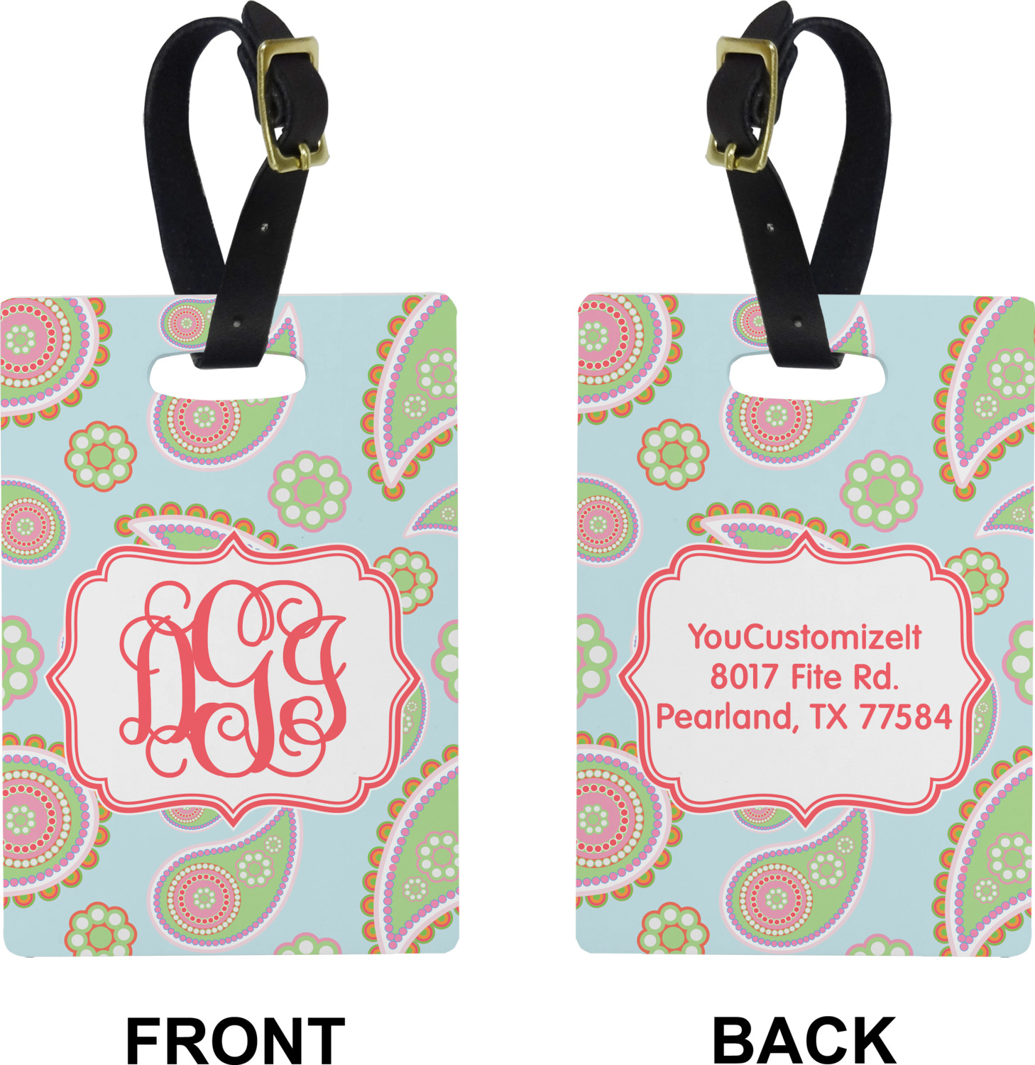 These personalized bag tags are sold in a variety of shapes, so that you may find the product that meets your vision exactly. We sell a round luggage tag, which measures at approximately 4" x 4". Our square luggage tag is about 3.5" x 3.5", while our rectangular version is 2.75" x 4 ".