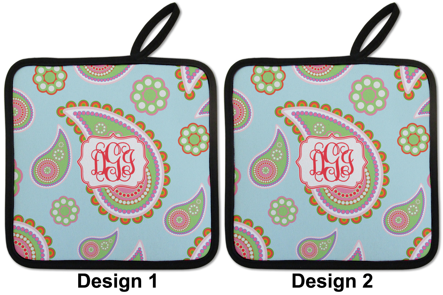 Our personalized pot holders feature a neoprene front that displays your personalization in vibrant colors. The backing of the hot pot holder is rubberized; the textured backing allows you to have a great grip when using this custom pot holder. The two materials are joined with a sleek, black trim, and the holder also includes an attached loop for hanging and storage. The pot holder is approximately 8.75 inches by 8.75 inches and 0.25 inches tall, while the fabric loop is 2.5 inches long. You can purchase a kitchen pot holder by itself or as a set of 2. We also offer a set including one pot holder and one oven mitt.