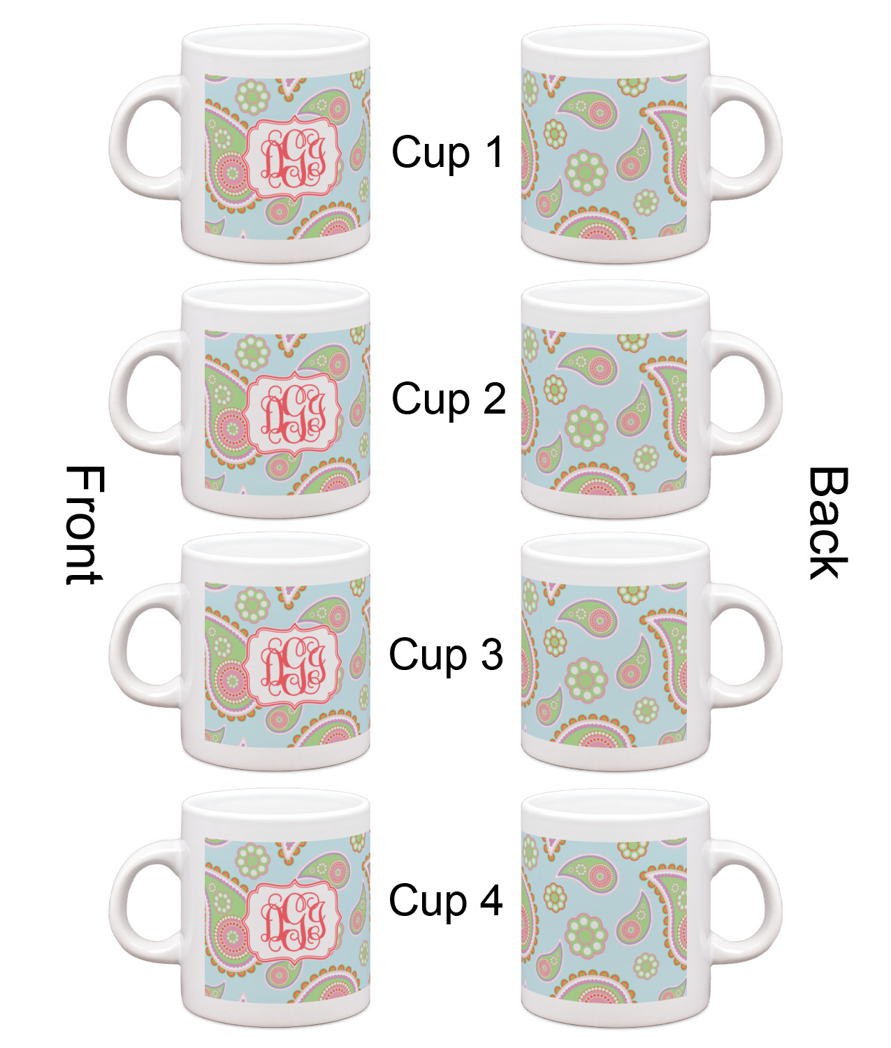 Each of our espresso mugs is a ceramic material sure to keep your drink warm. Personalize one cup for yourself, or order a set of 4! Its the perfect little gift for any coffee lover! We carry two sizes for you to personalize - 3 oz. (approx. 3.25" x 2.325" x 2.625") or 6 oz. (approx. 4" x 2.9" x 2.9"). Our 3 oz. mug is perfect for that single shot espresso while our 6 oz. mug can be your next favorite cappuccino cup holding two shots of espresso!