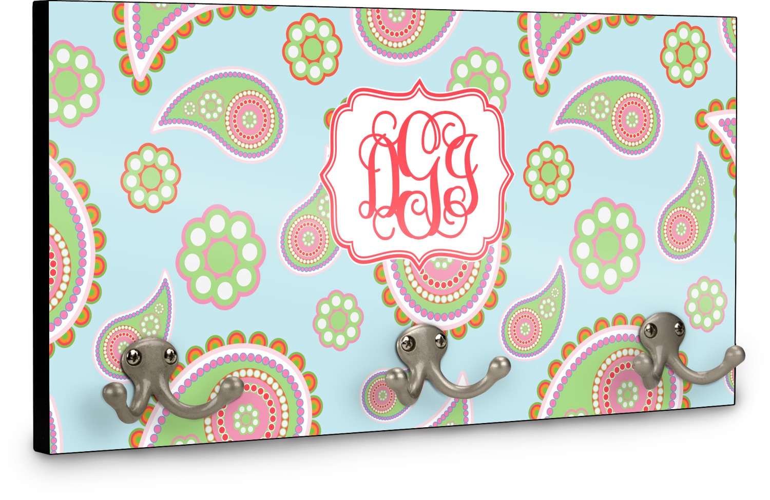 This coat rack is the perfect way to add some personality to your wall or entryway. The board is made of a strong maple that is approximately 16" x 8". The three 2-prong hooks are a sturdy metal that have three screws attaching them to the board. Your design is printed right onto the front of the board while the back and sides are a simple black.