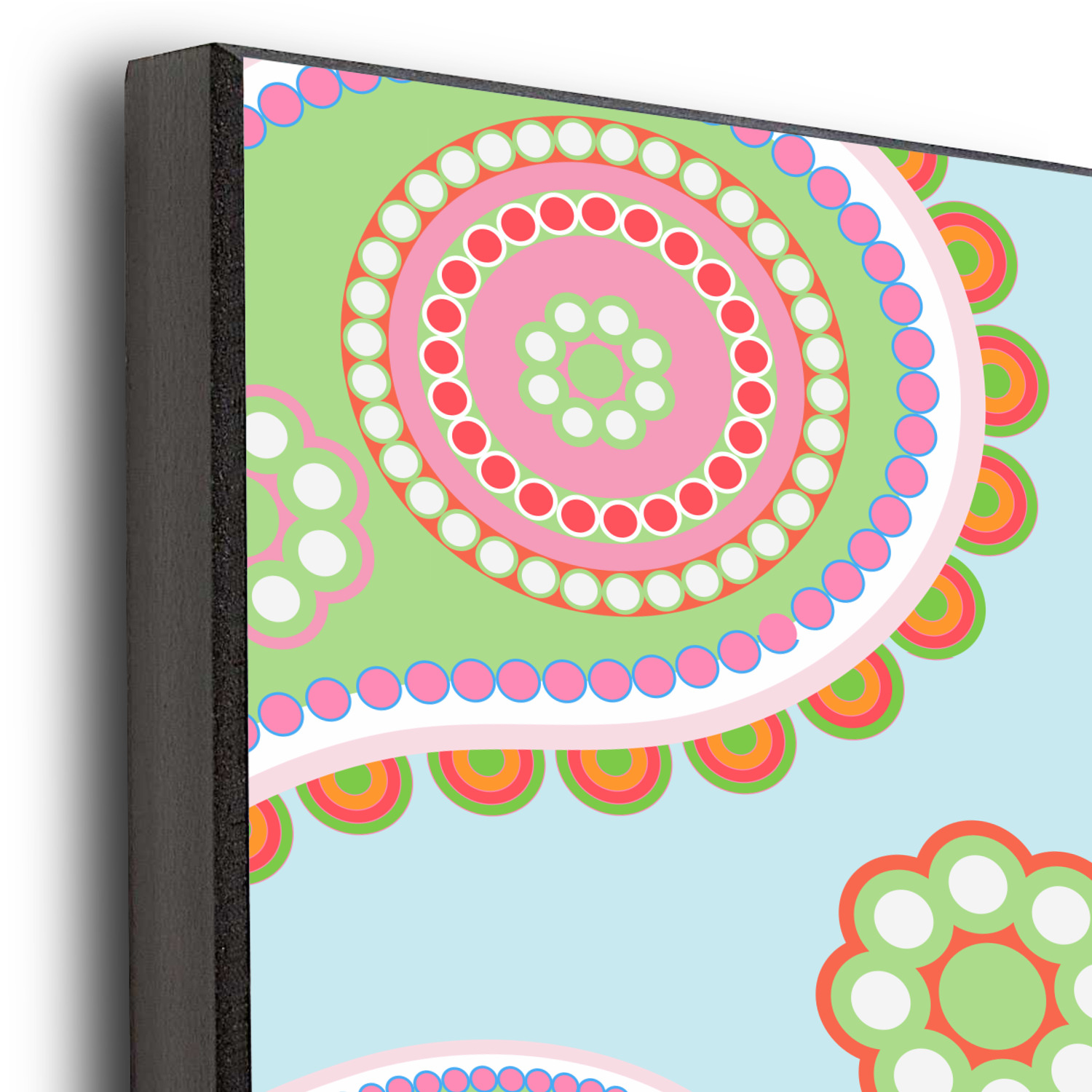 This design with paisley in green and coral on a blue background creates a nice balance between feminine and masculine colors.
