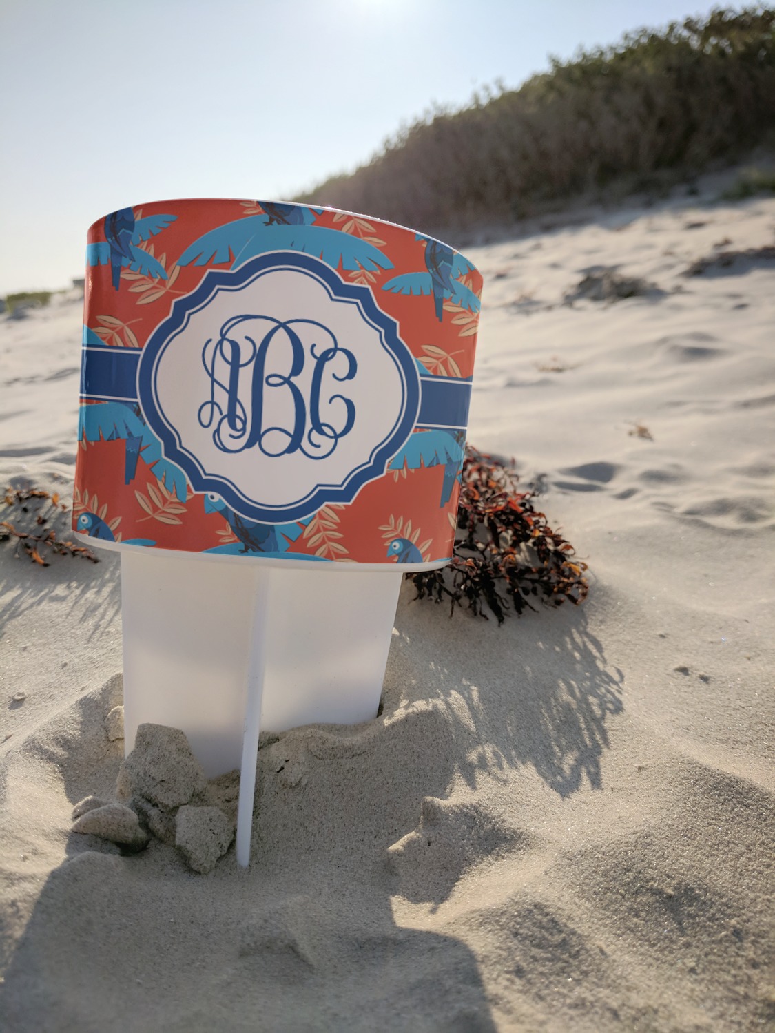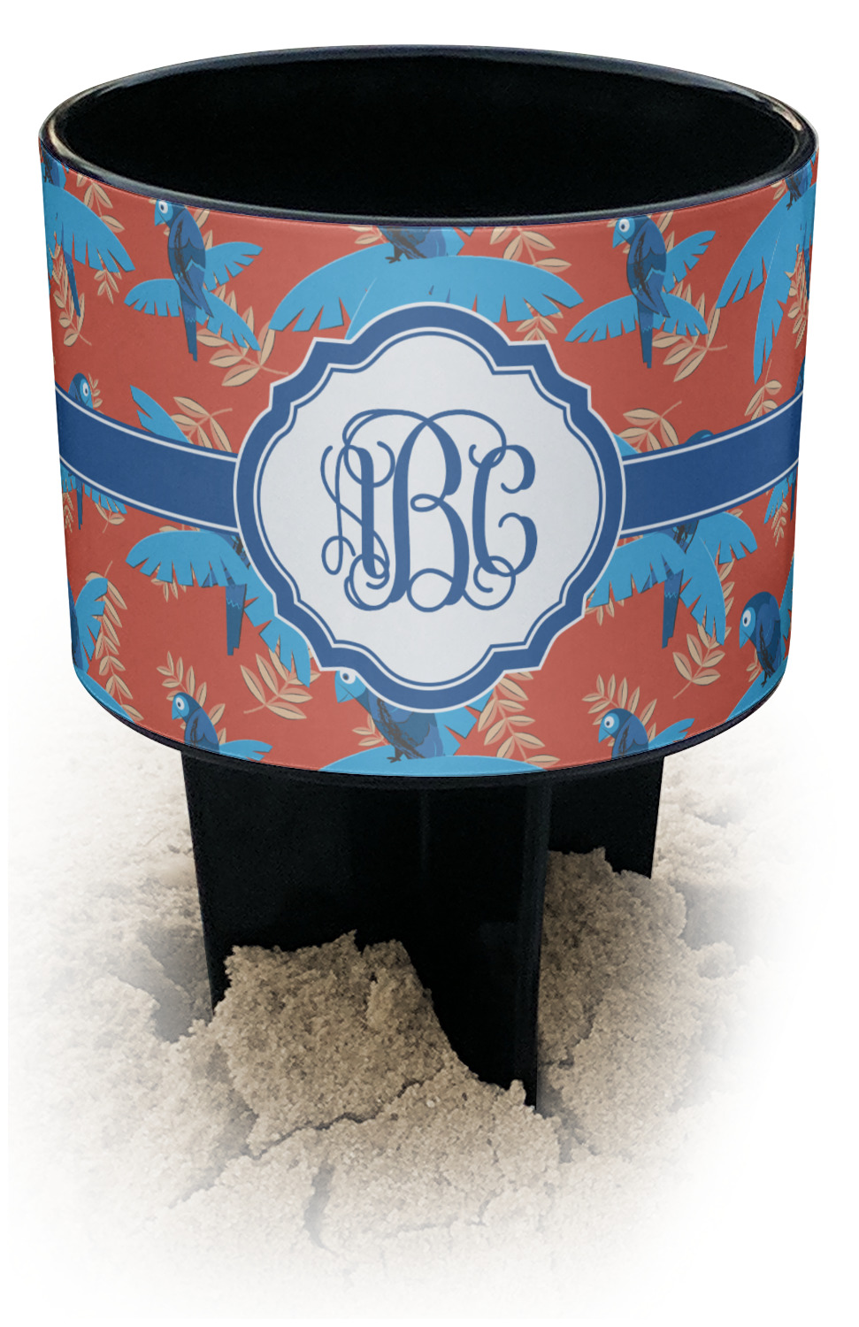 This cup holder has a large stake at its bottom that anchors it to the sand or ground below, while the cup holder rests above the stake. The entire drink holder is made of durable plastic and displays your customization around the cup holder portion. We sell these personalized beach spikers in two different colors: black and white.