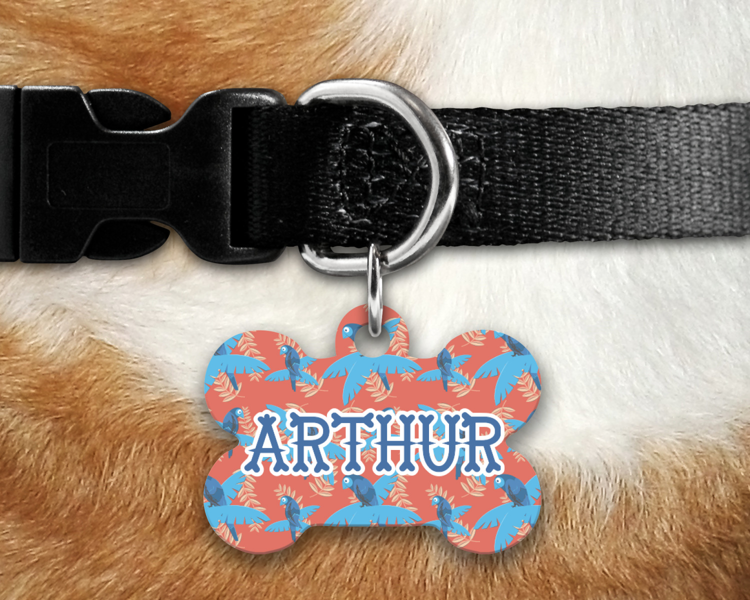 Our default design templates print your dog's personalization on the front and your contact information on the back; however everything is customizable, so you customize the patterns, the colors, the personalization, the contact information etc.