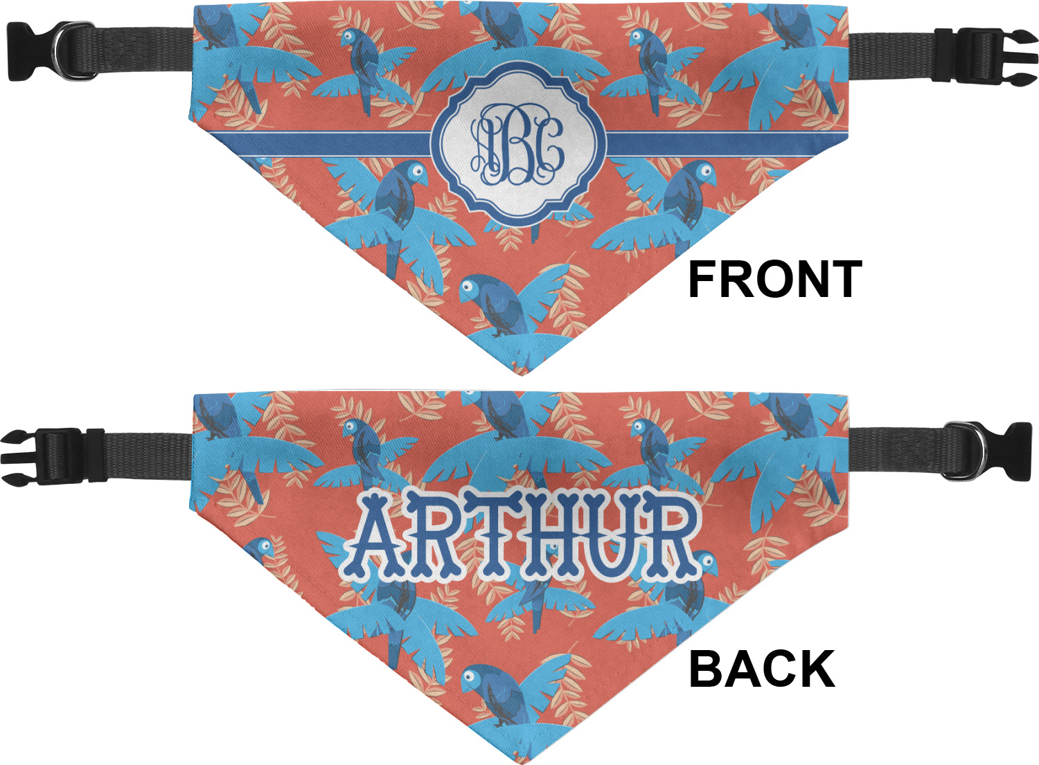We print the front and back of these dog bandanas with your customized design. The bandana itself is made from a durable polyester, sewn together with a gap large enough to accommodate any collar. Regardless, the bandana includes a plain black, canvas collar with plastic snaps, that can easily be removed if desired. These dog bandana collars are available in four sizes: small, medium, large, and extra large. Please see our sizing chart for more information regarding the dimensions of each size.