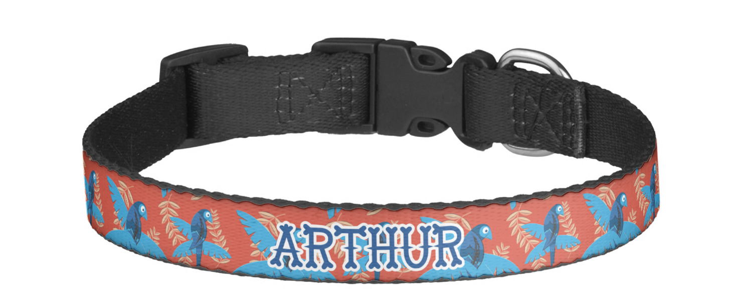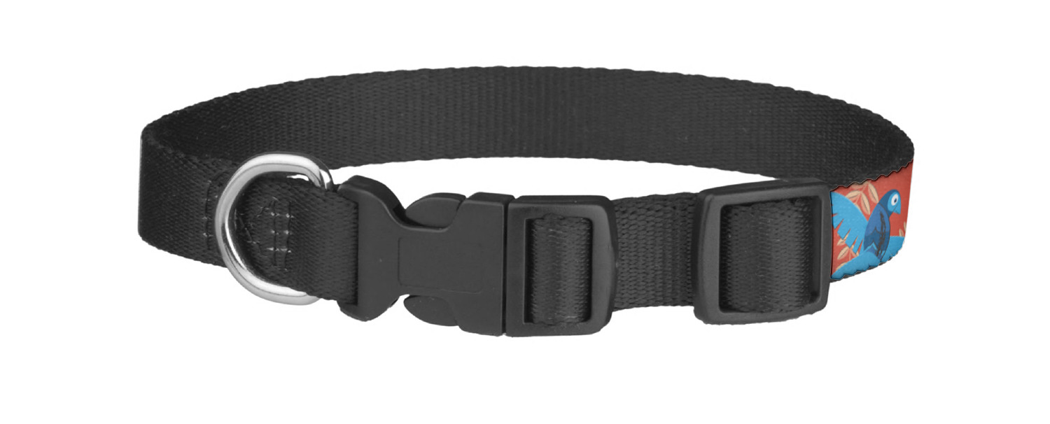 This sturdy collar, made from a durable nylon weave, will outlive your dog's episodes of excited tugging and pulling. Courtesy of its thick plastic buckle and adjuster, this collar is adjustable and accommodating of any dog. Structurally, the collar is a single piece of nylon weave that is sewn together, and features a solid metal loop where you can attach a leash or dog tag. We print and display your dog's name and pattern across the middle of the personalized dog collar.